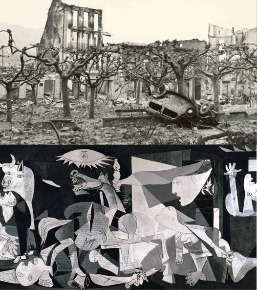 pablo picasso ist hunderte kilometer entfernt in paris. er hat zugesagt, ein bild für den spanischen pavillion auf der pariser weltausstellung zu liefern, die am 12. juli beginnt. von den gräuel in spanien erfährt er am 1.mai. er kennt weder das baskische gernika, das er kastillisch guernica schreibt, noch kann er sich vor ort ein bild von der tragödie machen. was er in den wenigen verbleibenden wochen auf die riesige, 27 qm große leinwand malen wird, ist eine wütende, in mythos und allegorie verpackte universelle anklage gegen den krieg – ohne angeklagte.