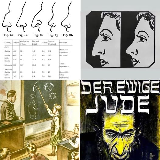 abbildungen, im uhrzeigersinn: zeichnung und tabelle aus der jacobs- bzw. fishberg-studie 1914; andy warhol, „vorher und nachher“, 1962; ns-plakat „der ewige jude“, 1940; illustration aus dem antisemitischen kinderbuch „der giftige pilz“ von julius streicher, 1938 (der junge zeigt auf eine „jüdische“ nase an die tafel, die bildunterschrift lautet: „die judennase ist an ihrer spitze gebogen. sie sieht aus wie ein sechser.“