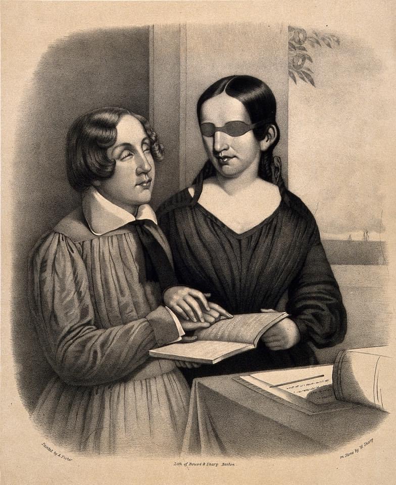 auf der litografie sieht man laura bridgman, das erste taube und blinde kind, das in den usa in den 1830ern braille lernte und hier einem freund das lesen beibringt…