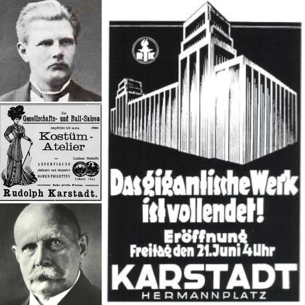 rudolph karstadt, *16.2.1856, eröffnete 1881 sein erstes „manufactur-, confections- und tuchgeschäft karstadt“ in wismar. aus ihm ging die karstadt ag hervor. er bezog die meisten seiner waren direkt beim hersteller und führte als erster festpreise ein. ende mit der feilscherei. bald begann karstadt auch kleidung in eigenen fabriken produzieren zu lassen und 1920 hatte er schon über 30 geschäfte in ganz deutschland. 1930 war karstadt mit 89 filialen, 27 fabriken und über 29000 angestellten europas größter warenhauskonzern. und viele seiner kaufhäuser waren highlights auch in architektonischer hinsicht, u.a. das in wismar (1908), hamburg (1912) und berlin-hermannplatz (1929). doch dann erwischte die weltwirtschaftskrise 1931/32 auch karstadt. erst standen mehrere etagen seiner riesigen neuen hauptverwaltung am alexanderplatz leer, am ende hatte rudolph karstadt sein gesamtes vermögen verloren. geblieben ist der name.