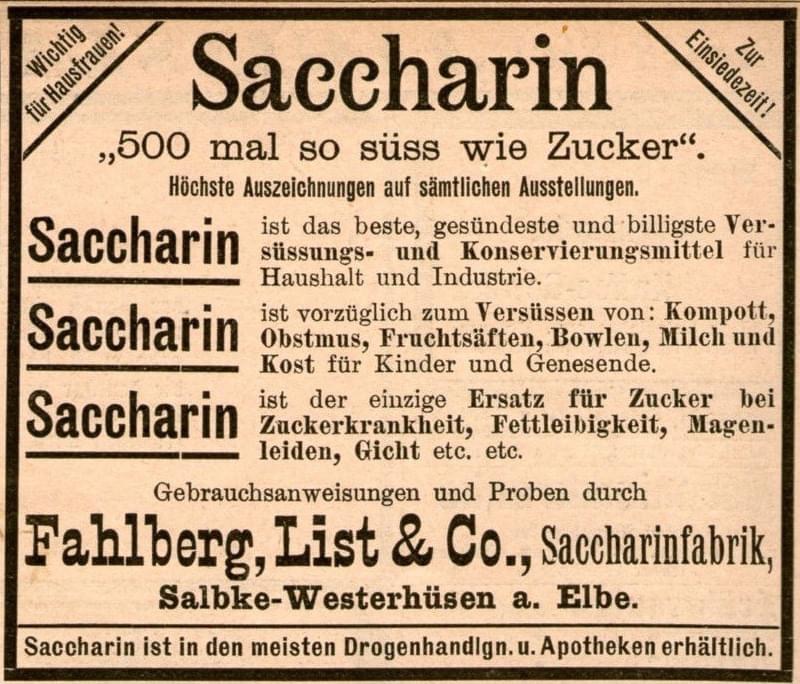 in den usa ließ sich das zeug wegen der hohen lohn- und rohstoffkosten aber nicht herstellen und so gründete fahlberg 1887 eine fabrik bei magdeburg. ein jahrzehnt später gab es schon sechs deutsche süßstoff-produzenten; da fahlberg den namen „saccharin“ hatten schützen lassen, mußten die sich neue namen ausdenken: zuckerin, sucrin, sycose, süßstoff höchst und sycorin.