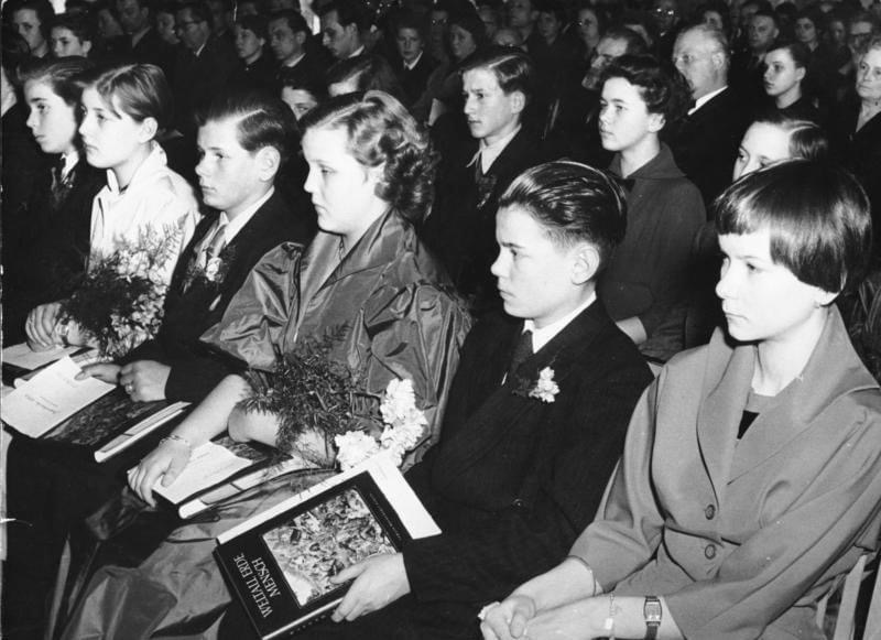den begriff „jugendweihe“ gibt es schon seit 1852, a-religiöse „erwachsenwerdungsfeiern“ noch mindestens 20 jahre länger; die erste jugendweihe in der ddr fand am 27. märz 1955 65 in ost-berlin statt (foto) und war von da an (erwünschter bis erzwungener) fester bestandteil der staatlichen erziehung. inklusive vierfachen gelöbnisses: