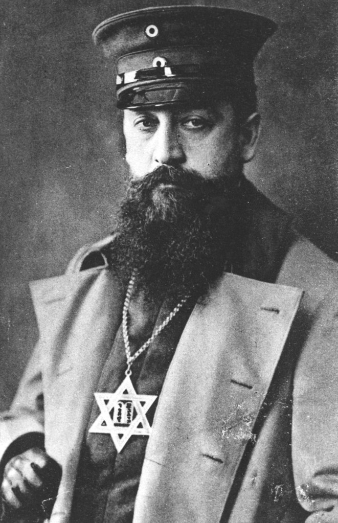 foto: der verband legte auch das habit der rabbiner, analog zu christlichen feldgeistlichen, fest: feldgrauer rock mit lila besatz, reithose, gamaschen, schnürstiefel, südwester, armbinde und kette mit davidstern. der abgebildete – dr. jakob sonderling – hat es vielleicht mit letzterem ein wenig übertrieben:) das bild stammt aus der ersten großen arbeit, die zu dem thema überhaupt erschienen ist: sabine hank, hermann simon, uwe hank: „feldrabbiner in den deutschen streitkräften des ersten weltkrieges“, hentrich & hentrich 2013