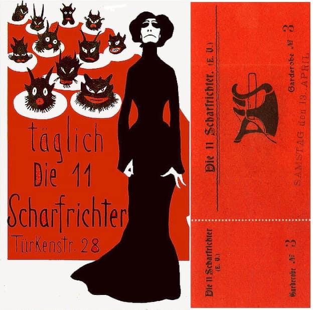 13.april 1901. geburt des deutschen kabaretts. die „elf scharfrichter“ präsentieren ihr erstes programm im hinterzimmer der gaststätte „zum goldenen hirschen“ in der münchner türkenstraße. um die kontrolle durch die zensurbehörde zu umgehen, hatten sie sich als geschlossener verein eintragen lassen, durften als solcher aber keinen eintritt verlangen und verkauften stattdessen garderobenscheine (wie rechts auf dem bild). die etwa hundert zuschauer erwartete ein bühne mit rot gedämpftem licht, nette requisiten wie folterwerkzeuge, totenkopf mit perücke und pranger und natürlich die rotgewandeten „scharfrichter“ (u.a. otto falckenberg, leo greiner und frank wedekind) sowie ihre „henkersknechte“ (unter ihnen die chansonniere marya delvard, die einzige frau der truppe, hier abgebildet auf dem plakat von t.t.heine). das programm: satirische „exekutionen“ von anstand und moral, zensur und obrigkeitshörigkeit mittels gesang, gedichtrezitationen, tanz, puppenspiel und sketchen. publikum und presse waren begeistert. die melange (inkl. des begriffs „kabarett“) war bis dahin einmalig auf deutschen bühnen und sollte stilbildend für die kommende deutsche kabarettszene sein, auch wenn die elf pioniere selbst wegen dauernder probleme mit ihren finanzen und den zensurbehörden schon 1904 wieder aufgaben.