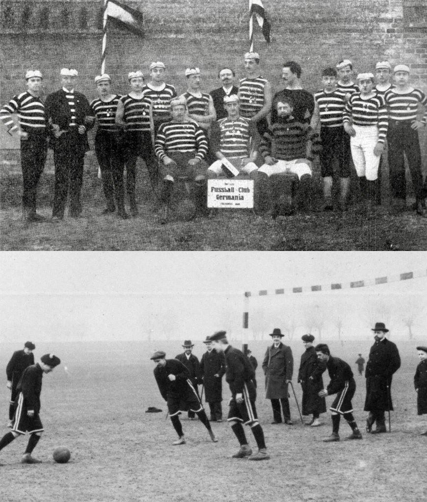 am 15. april 1888 gründeten ein paar teenager den ältesten heute noch existierenden fußballverein deutschlands: den „berliner fußball-club germania 1888“ (wegen dessen namen sich vier jahre später ein anderer klub, der eigentlich auch „germania“ heißen wollte, „hertha bsc“ nannte). die jahresangaben in anderen fußballvereinen (tsv 1860 münchen, vfl bochum 1848, ssv ulm 1846 usw) verweisen nur auf die gründungsdaten der jeweiligen turnvereine, die ihre fußallabteilungen aber erst später einrichteten. andere, die tatsächlich schon vor „germania“ gegründet wurden wie 1885 der fußballkub frankfurt, existierten heute nicht mehr. allerdings war der b.f.c. germania 1888 auch der erste verein, der sich nach der machtübergabe an die nazis damit rühmte, seine jüdischen mitglieder ausgeschlossen zu haben. heute spielt germania 1888 – der in den anfangszeiten auf dem tempelhofer feld knödeln musste (unteres bild), da es noch keine fußballplätze gab, und damals zu den besten deutschen vereinen zählte – in der vorletzten kreisliga.
