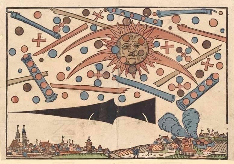 am frühen morgen des 14. april 1561, die sonne geht gerade auf, bekommen die bürger von nürnberg eine art luftkrieg zwischen mehrgliedrigen kugeln und zylindrischen objekten am himmel zu sehen – ein spektakel, dass der briefmaler und drucker hans glaser fünf jahre danach auf diesem handkolorierten flugblatt festhält – „ein vngewonlich gesicht / an der sonnen erschinen“, das von „vielen manns und weybspersonen“ gesehen worden…