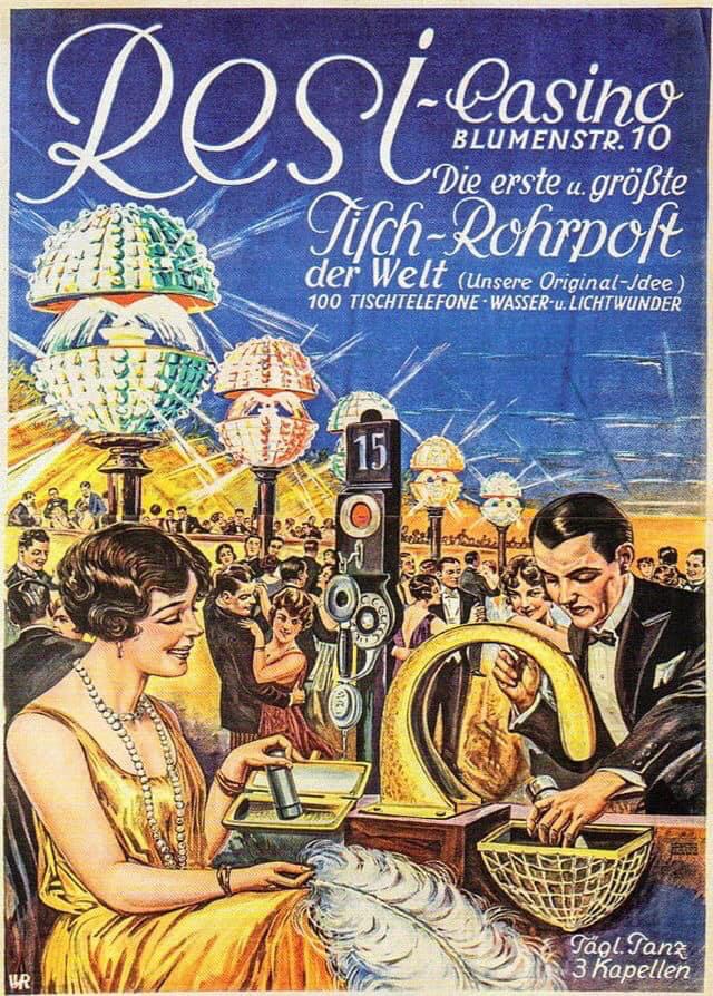 wer zu schüchtern zum telefonieren war, konnte der/dem angepeilten stattdessen eine botschaft per rohrpost zukommen lassen. denn przystawnik hatte auch eine rohrpostanlage mit 135 ausgabestellen gebastelt. man konnte aber nicht nur briefchen, sondern auch kleine geschenke durchs rohr jagen. die gab es praktischerweise gleich mit zu kaufen; die gäste hatte die wahl zwischen 135 artikeln. beides kam bombig an. baatz warb auf postkarten mit “jeder einmal in berlin, jeder einmal im resi” – eine aufforderung, die für berliner nicht nötig war. sie rannten ihm die bude ein. das resi war der perfekte ort zum anbandeln. und zum stauen über die wunder der technik.