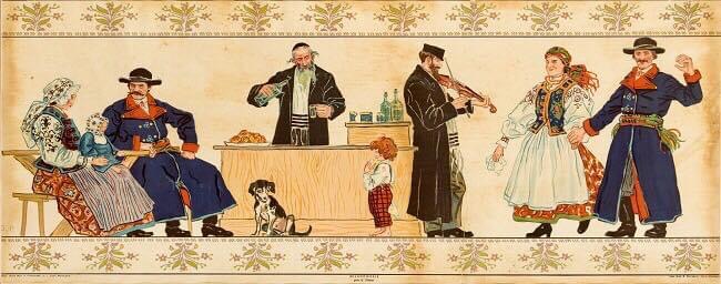in polen lebten 80% der jüdischen landbevölkerung vom destillieren und verkaufen von bier und wodka (laut volkszählung 1764). auch viele gastwirte waren juden, weil sie schlicht weniger soffen als die polen und somit als nüchterner und zuverlässiger galten als die polnische bevölkerung. das image des freundlichen jüdischen gastwirts überlebte u.a. in der figur des jankiel im polnischen nationalepos „pan tadeusz“ von adam mickiewicz, 1834 (oben eine illustration von gustaw pillati zu einer der ausgaben). erst im 19. jahrhundert wurden juden durch antisemitische gesetze aus dem bier- und spirituosenhandel in polen verdrängt.