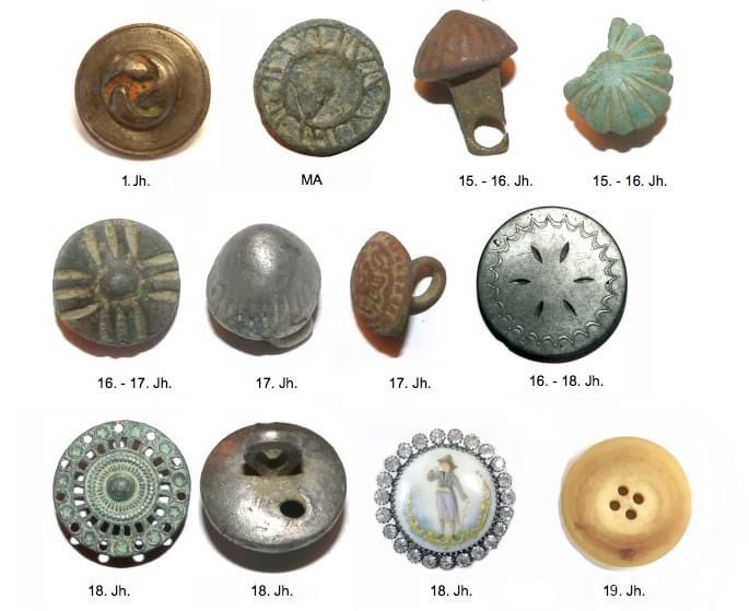 „blinde knöpfe“, die also nur zierten, aber nichts zusammenhielten, gab es schon zur jungsteinzeit und man hat auch mit stoff überzogene (bern)steine aus dem 6. jhrtsd v.u.z. gefunden. diese „blinden knöpfe“ sind die eigentlichen vorläufer der knöpfe, wie wir sie kennen. die perser (500 v.u.z.) benutzten schon geflochtene textilkugeln, die durch schlaufen aus stoff oder leder geknüpft wurden (sieht man in asien heute noch). aber knöpfe, die durch ein eigenes loch in der kleidung gesteckt wurden, sind erst ab dem 12.jh. nachweisbar, und zwar in deutschland (ja, die deutschen haben das knopfloch erfunden!). als die kleidung im 13.jh. körpernäher und schmaler wurde, setzte sie sich diese verbindungsmethode endgültig durch. im späteren mittelalter entstand mit der steigenden nachfrage nach dem revolutionären neuen verschluss auch das handwerk des knopfmachers (die erste deutsche knopfschmiede ist 1363 in der „nürnberger handwerksmeisterliste“ verzeichnet) und die ersten zünfte, die das terrain unter sich aufteilten, wurden gegründet.