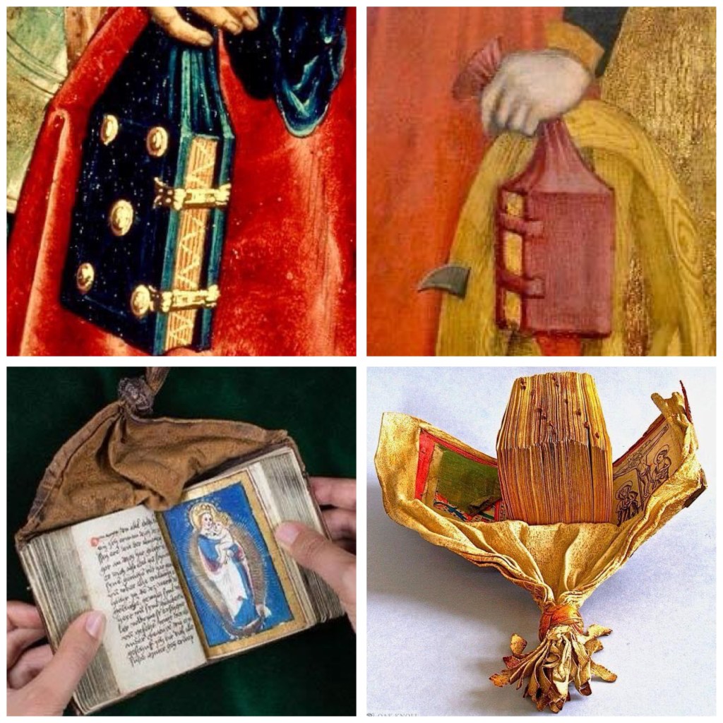 find ja diese beutelbücher äußerst schick. sie sind leider ausgestorben. waren vom 14. bis 16. jh. in mode, heute existieren nur noch schlapp zwei dutzend originale, aber abbildungen gibt’s reichlich. wie man sieht, hatten sie über dem eigentlichen bucheinband aus holz und leder einen zweiten bezug, der so weit über das buch herausragte, dass ein großer zipfel entstand, den man, mit bändern oder messingringen versehen, am gürtel befestigen konnte oder man trug das ding wie eine handtasche, um nicht zu sagen wie den stoffbeutel aus’m osten. verglichen mit den sonst zu dieser zeit üblichen riesenfolianten jedenfalls sehr innovativ und praktisch. besonders für händler, die mal eben ein paar zahlen notieren oder für angeber, die ihre bildung und ihren status vorführen wollten. wie heute das neuste iphone oder so. zuerst wurden sie aber von geistlichen für religiöse texte benutzt und auch in klosterbuchbindereien hergestellt. erst dann entdeckten wanderärzte und kaufleute sie für sich; dank der holzdeckel und metallbeschläge konnte man unterwegs auch prima wegelagerer damit verkloppen, echt jetzt. und die reichen hofdamen ließen sich ihre bunt ausgemalten stundenbücher als beutel binden, um sie dekorativ am gürtel herumtragen zu können. dafür duften sie natürlich nicht allzu groß sein. sie hatten maximal heutiges taschenbuchformat. eines der erhaltenen originale von 1540, das der nonne katharina röder von rodeck gehörte, mißt sogar nur knapp 10×8 cm.