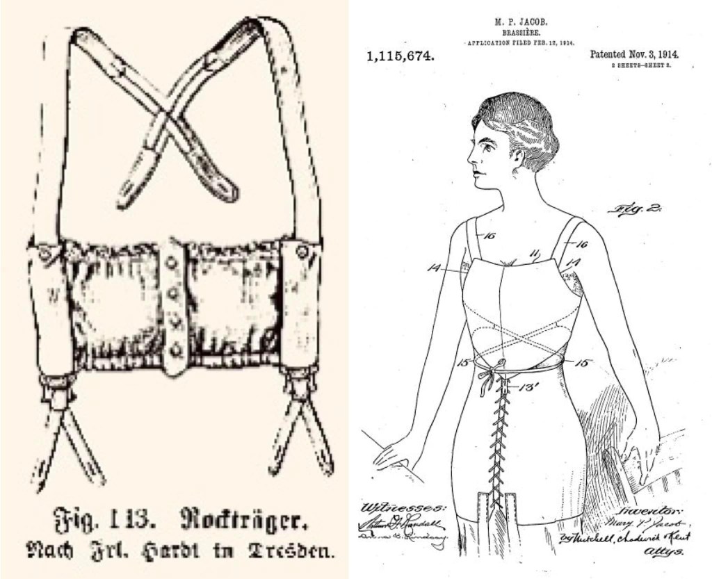 als erfinderin des büstenhalters gilt gemeinhin die amerikanerin mary phelps jacob, die ihren 1914 patentieren ließ (er bestand aus zwei tüchern und bändern). doch gab es schon vorher patente auf das gute stück. hugo schindler aus böhmen meldete bereits 1893 einen büstenhalter zum kaiserlichen patent nr. 62641 an (zwei an einem gürtel befestigte kappen); 1899 folgte die pariser schneiderin herminie cadolle und die erste deutsche, die krankengymnastin christine hardt aus dresden, die ein verstellbares modell aus zusammengeknüpften taschentüchern und männerhosenträgern, das „frauenleibchen als brustträger“ als patentschrift nr. 110888 anmeldete. 1904 entwickelte wilhelm meyer-ilschen aus cannstatt eine „bruststütze ohne unterteil“, den seine schwiegervater sigmund lindauer unter der marke „prima donna“ ab 1912 in serie fertigen ließ. all diese ersten „offiziellen“ büstenhalter wurden noch aus leinen hergestellt und meist vorne geschlossen.
