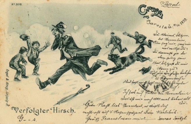 „es küsst dich recht oft auf’s nasenspitzerl dein karli-bub“ steht auf einer postkarte, die weniger interessant ist, weil „karli-bub“ 1899 offenbar heftig in „spatzerl“ verknallt war, sondern weil er seinen liebesgruß neben eine karikatur gequetscht hat, die einen juden zeigt, der vor einem kläffenden köter und jubelnden kindern flüchtet, die ihn mit schneebällen bewerfen. karten, die ihren „witz“ aus dem gegensatz zwischen einem stolzen namen wie eben hirsch (bär, löwe) und einer abgebildeten jammergestalt ziehen, gehören zu den klassikern unter den judenfeindlichen postkarten der wilhelminischen zeit, ähnlich wie eine serie mit „dem kleinen cohn“, der hier in immer neuen, oft gereimten episoden lächerlich gemacht wird – mal wurden die karten mit erläuterung zum bild verschickt, meist aber ohne bezugnahme, einfach so: „herzliche sonntagsgrüße von uns allen, deine mutter“.