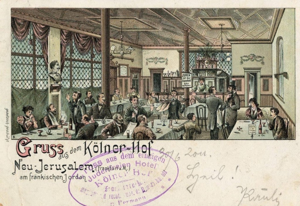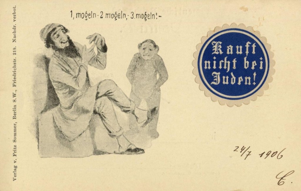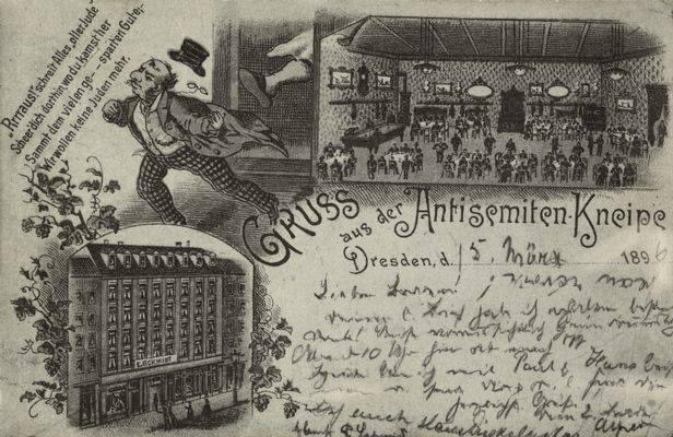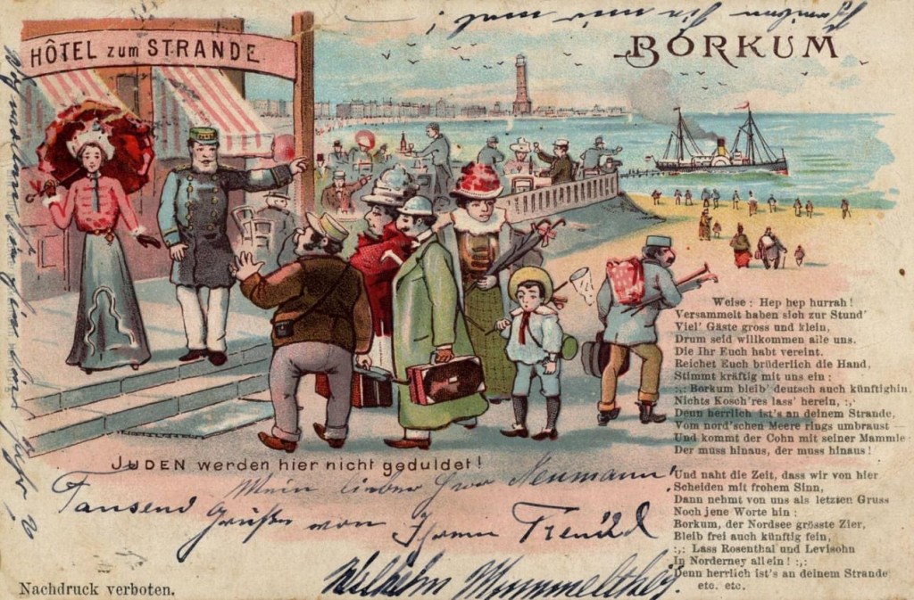 urlaubsorte wie zinnowitz oder die nordseeinsel borkum forderten auf ihren karten: „…doch wer hier naht mit platten füßen, mit nasen krumm und haaren kraus, der soll nicht deinen strand genießen, der muß hinaus“. ein frankfurter hotelier bewarb seine gäste bereits 1896 mit karten, auf denen „juden-frei!“ stand und auch die aufforderung „kauft nicht bei juden!“ ist keine erfindung der ns-zeit, sondern zierte postkarten schon zur jahrhundertwende. zu dieser zeit hatten antisemitische parteien auch längst begonnen, die auswanderung der juden zu fordern. es gab „freifahrkarte nach jerusalem… hin und nicht wieder zurück“-karten und andere, auf denen juden per fußtritt aus der kneipe, der stadt oder dem land befördert wurden.