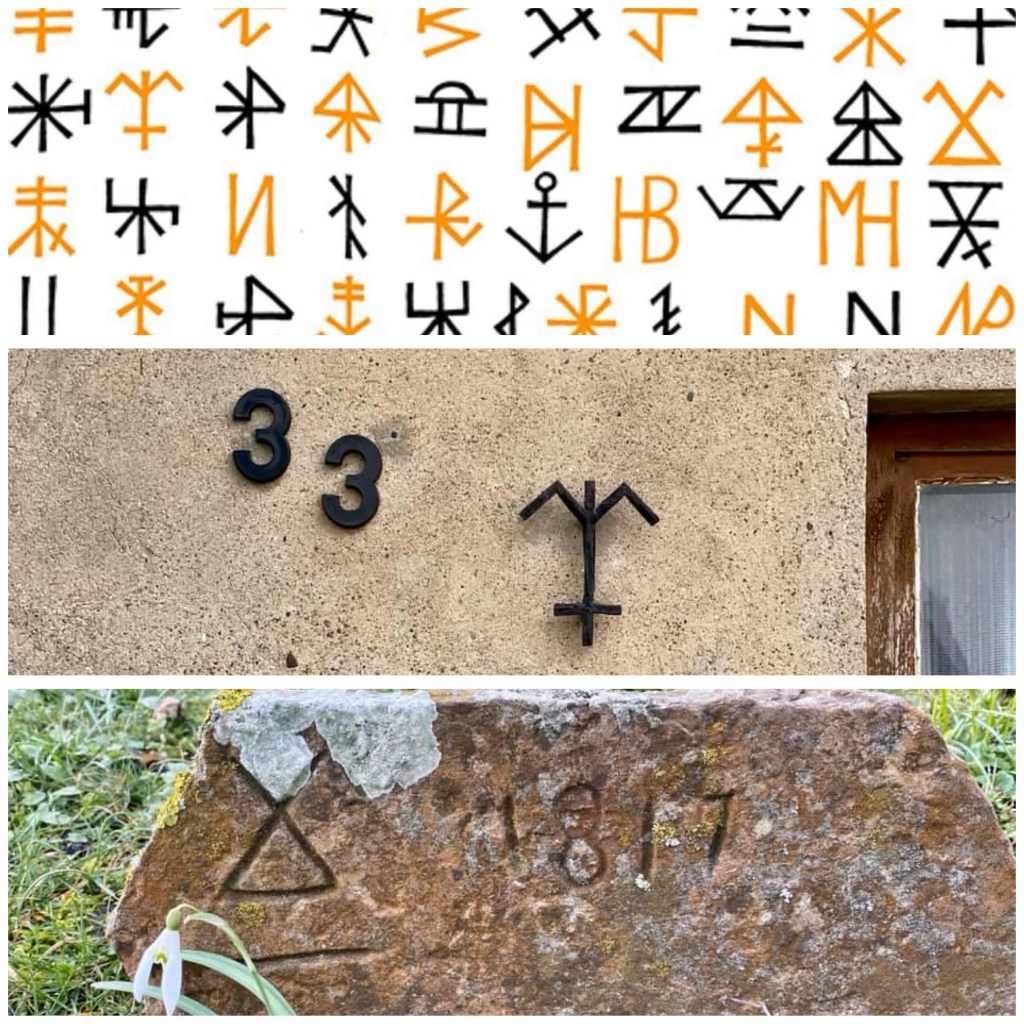 diese runenartigen zeichen gibt es seit etwa dem 13. jh. auf hiddensee. die insulaner, die ja früher meist analphabeten waren, markierten damit ihr eigentum: fang-, haushalts- und landwirtschaftsgeräte (von netzen, reusen, booten oder pflügen bis hin zu besteck und wäscheklammern), ihre wiesen und ihr vieh (schafe zb. bekamen ein kleines stück leinen mit dem zeichen ins fell genäht).