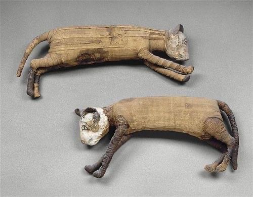 bislang hat man in ägypten 130 tierfriedhöfe lokalisiert (und natürlich wurden auch andere tiere mumifiziert, zb. mungos, die als vertilger von schlangen geschätzt waren, hunde, die dem gott anubis, dem schutzherren der gräber geweiht waren, oder auch schafe, affen, rinder, krokodile, gazellen, schlangen, käfer und unzählige vogel- und fischarten). wegen der millionen aufgefundenen katzenmumien haben die forscher früher angenommen, die tiere wären weit weniger sorgsam als menschen konserviert worden. untersuchungen mit modernen methoden zeigen aber, dass das verfahren in einigen dynastien und bei heiligen katzen ähnlich komplex wie bei menschen war. schon der griechische historiker herodot hat drei verfahren beschrieben, je nach „stellung“ der katze. die oberste stufe beinhaltete das komplette ausweiden des körpers, das dörren der organe, das bandagieren des körpers und die einbalsamierung mit bienenwachs, tierischen und pflanzlichen fetten, ölen und harzen.