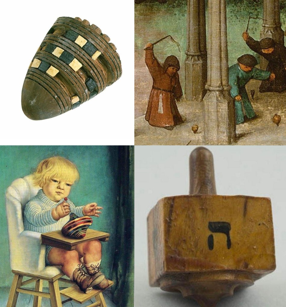 und dann gibt es noch die kreisel für gewinn- oder glücksspiele. hier hat der kreisel vier oder sechs seiten mit verschiedenen werten, und je nachdem, auf welcher seite er zu liegen kommt, gewinnt oder verliert der spieler seinen einsatz. ha, denk ich, kenn ich! chanukka! das haben die von unserem dreidel abgeguckt. stimmt aber nicht.
