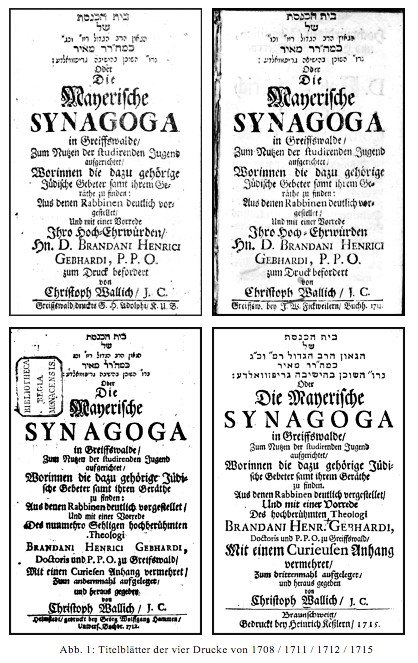 Wallichs Buch hat aber auch ausgesprochen komische Stellen. So steht auf dem Deckblatt über dem deutschen Titel ein hebräischer, der übersetzt lautet: „Die Synagoge des Gaon und bedeutenden Rabbis, des Hauptes der Jeschiwa und Hohenpriesters, seiner Ehren, unseres Lehrers, des Rabbis, Rabbi Mayer, möge Gott ihn segnen und bewahren, der in der Stadt Greifswald lebt“. Wallich macht seinen christlichen Patron, den Pfarrer und Dekan Mayer also zum Rabbiner, zum weisen Haupt einer Talmud-Tora-Schule und Besitzer einer Synagoge und listet in seiner Widmung auch noch 18 berühmte Rabbiner auf, die ebenfalls Me’ir bzw. Mayer hießen.