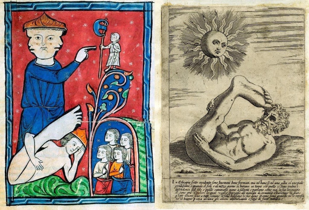 dachte erst an mittelalter-yoga. aber bei den gelenkigen herren handelt es sich um mono- bzw. skiapoden (ein- bzw. schattenfüßler) – fabelwesen mit einem riesigen bein, mit dem sie superschnell rennen und springen können. und da sie extrem blass und lichtempfindlich sind, legen sie sich mittags auf den rücken und nutzen ihren riesenfuß als sonnenschirm.
