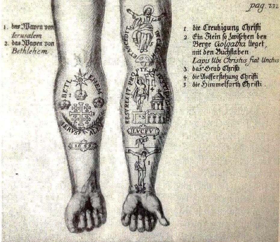 die christlichen tattoos folgen einer langen tradition der souvenirsammlung der pilger und kreuzritter. seit dem 4.jh. brachten pilger erinnerungen von den heiligen stätten nach hause mit, von winzigen ampullen mit öl bis hin zu schweren modellen sakraler bauten. eine tätowierung aus jerusalem oder bethlehem aber war quasi der lebenslange beweis, dass sie dort gewesen waren, ein „marker“ des bundes mit gott, ein positiv gewendetes kains-mal oder ein mit den wunden christus‘ verglichenes „stigma“. der erste schriftlich erwähnte tätowierte pilger war der deutsche adlige alexander von pappenheim, der 1563 einen araber in jaffa für ein kleines kreuz-tattoo auf seinem linken oberschenkel bezahlt hatte. die meisten tattoos dürften aber von franziskaner-mönchen (die die heiligen stätten verwalteten) und auf den oberen gliedmaßen gestochen worden sein. ein henry maundreleine schreibt 1697: „sie haben holzstempel mit jeder figur, die gewünscht wird. die drucken sie zuerst mit holzkohlepulver auf den arm; dann nehmen sie zwei sehr feine nadeln, die eng zusammengebunden sind und tauchen sie oft wie einen stift in eine bestimmte tinte, die, wie mir mitgeteilt wurde, aus schießpulver und ochsengalle besteht, und machen mit ihnen kleine einstiche entlang der linien der figur. am ende waschen sie die stelle mit wein…“. das wort „tatoo“ benutzte der autor aber noch nicht. das wanderte erst knapp hundert jahre später durch james cooks berichte aus dem tahitianischen „tatao“ in die europäischen sprachen ein.