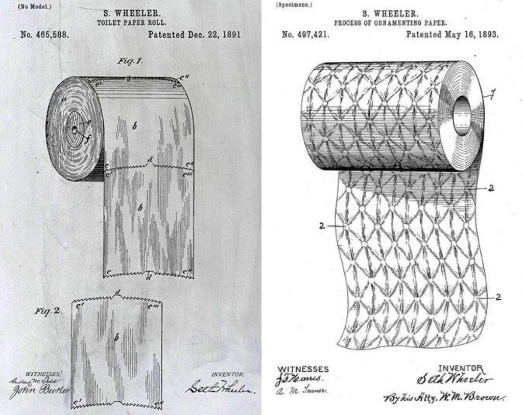 erst dacht ich bei dem bild: hah, der ewige streit darum, wie rum das klopapier zu hängen hat, ist schon 1891 geklärt worden: mit dem patent von seth wheeler aus albany, new york. aber nee: zwei jahre später hat der ästhet ein toilettenpapier mit muster patentieren lassen und das hängt genau andersrum. also klopapierliteratur wälzen: in der bronzezeit wurden pestwurzen-blätter zum po abwischen benutzt.