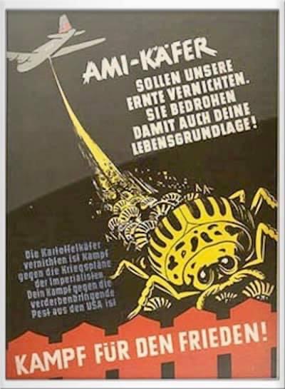 am 16. Juni 1950 wartet das „neue deutschland“ mit einer irren schlagzeile auf: „außerordentliche kommission stellt fest: usa-flugzeuge warfen große mengen kartoffelkäfer ab“. am nächsten tag meldet die ddr-nachrichtenagentur adn gar, dass „kartoffelkäfer-geschwader in stärke von 45 flugzeugen“ mit unkenntlich gemachten hoheitsabzeichen in das kreisgebiet von worbis in thüringen eingeflogen seien. und die sowjetische „tägliche rundschau“ weiß auch warum: „die ständig steigende verbesserung der versorgungslage in der republik“ sei den amis ein dorn im auge, deshalb versuchten sie, die ddr-landwirtschaft zu schädigen, und da dies „naturgemäß auf legalem wege niemals möglich ist, scheuen sie auch vor abscheulichsten verbrechen nicht zurück“.