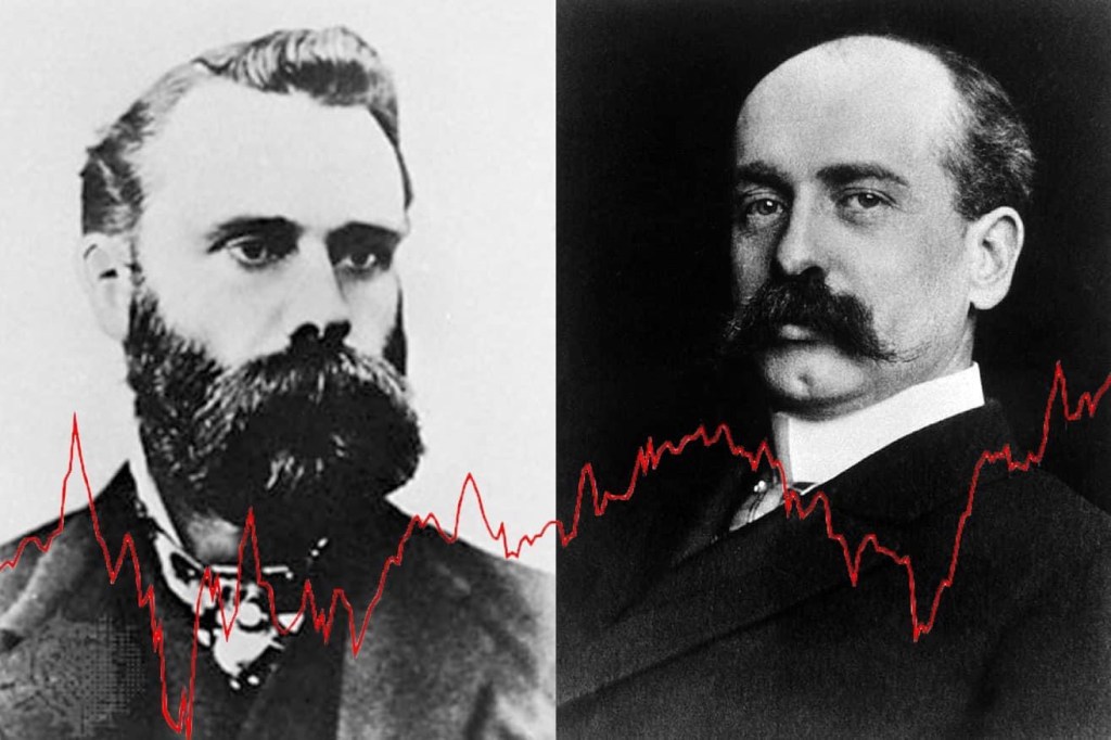 um aktienkursschwankungen besser beurteilen zu können entwickeln zwei herausgeber des wall street journals einen aktienindex, der am 26. mai 1896 erstmals an der new yorker börse veröffentlicht wurde und uns bis heute beschäftigt. auf dem bild die namensgebenden herren: charles dow (1851-1902) und edward davis jones (1856-1920)