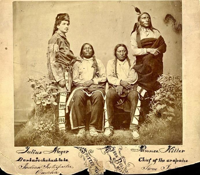 links julius meyer, 18.5.1839 in bromberg/preußen geborener sohn von kaspar und rosalia meyer wanderte 1867 in den wilden westen aus. er nahm ersten kontakt mit indianern als händler auf und lernte sieben ihrer sprachen. die stämme vertrauten ihm. die lakota und oglala sioux nannten ihn box-ka-ra-sha-hash-ta-ka (lockiger weißer chef mit einer zunge) und er sich „indian interpreter“. meyer dolmetschte u.a. für sitting bull, red cloud und bei verhandlungen der indianer mit dem kongress. außerdem betrieb er einen laden, das „indian wigwam emporium“, belieferte auch europäische museen mit indianischen kuriositäten und begleitete eine delegation von indianern nach paris.