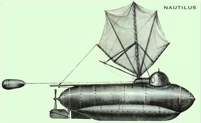 am 3. juni 1801 führt der amerikaner robert fulton in le havre einer erstaunten marinekommission sein unterseeboot vor: die „nautilus“. es gab schon vorher versuche mit tauchbooten (von cornelius drebbel 1620, denis papin 1691 und david bushnell 1776), aber die waren allesamt aus holz, klein und dümpelten knapp unter der wasseroberfläche herum. fultons „nautilus“, die er seit 1793 entwickelt hatte, besaß hingegen eine kupferhülle, die auf ein bootsgerippe aus eisen montiert war und maß 6,5 x 2 meter. über wasser wurde sie mit einem segel in bewegung gesetzt und unter wasser mittels eines propellers, der über eine handkurbel gedreht wurde. auftrieb bekam sie durch fluten und leeren des kiels (die aufnahme von vier, fünf litern wasser genügte, um sie abtauchen zu lassen), der sauerstoff für die drei mann besatzung wurde durch einen lederschnorchel zugeführt und für die beleuchtung gab es ein paar kerzen und etwas licht durch ein kleines fenster.