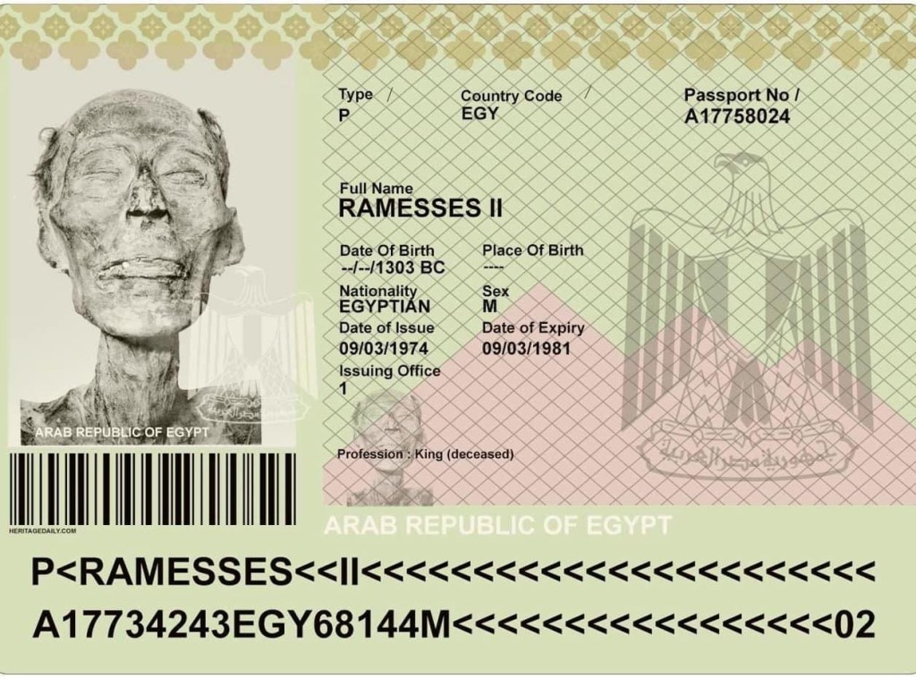 das bild: 1974 stellten mitarbeiter des kairoer museums fest, dass sich der zustand der mumie rasant verschlechtert hatte und wollten sie in paris untersuchen lassen. weil nach ägyptischen gesetzen eine aus- oder einreise – egal ob tot oder lebendig – nur mit gültigen personaldokumenten erlaubt war, stellten die behörden ramses einen pass aus, der zudem als versicherungsschutz dienen sollte, für den fall, dass die franzosen die mumie hätten nicht zurückgeben wollen.