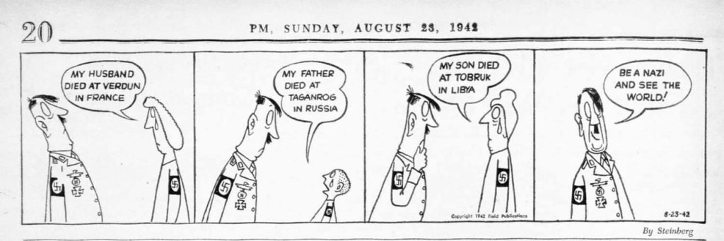 steinberg wurde anschließend nach nordafrika und dann nach italien versetzt. hier zeichnete er wieder propagandabilder (zb. klopapier mit hitler-konterfei), die nazis lächerlich machen und so aussehen sollten, als stammten sie aus dem deutschen widerstand und die hinter den feindlichen linien abgeworfen wurden (beispiele am anfang der bildreihe).