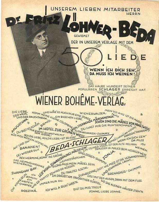 fritz löhner (*24. juni 1883 als bedřich löwy, kosename und pseudonym: beda) war promovierter jurist, passionierter fußballspieler und begnadeter textdichter. vielleicht nicht ihn, aber seine libretti und schlagertexte (u.a. für franz lehar und die comedian harmonists) kennt bis heute fast jeder: land des lächelns, blume von hawaii, ball im savoy, in der bar zum krokodil, ausgerechnet bananen, ich hab’ mein herz in heidelberg verloren, oh donna clara, wo sind deine haare august, was machst du mit dem knie lieber hans, freunde, das leben ist lebenswert…