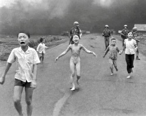 aus den vielen bildern napalmzerfressener menschen wählen die redakteure dieses eine foto aus, sie wissen, dass leidende und nackte körper am stärksten triggern. es erscheint am nächsten tag auf der titelseite der new york times zu einem bericht von fox butterfield. das rechte drittel des originalbildes (hier 2.bild) fehlt. es hätte kein sonderlich günstiges bild auf die anwesenden mendienvertreter geworfen. es zeigt weitere fotografen in militärischer uniform am straßenrand, von denen einer anscheinend ungerührt gerade den film in seiner kamera wechselt – und dass niemand den vor angst und schmerzen schreienden kindern hilft, auch nicht die fotografen, auf die sie direkt zurennen und nicht die, die auf der langen straße hinter ihnen herlaufen (3.bild).