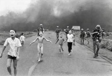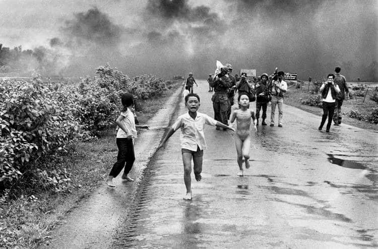 nachdem die flugzeuge abgedreht sind und der rauch sich verzogen hat, sehen die journalisten verängstigte dorfbewohner und einige von dem angriff überraschte südvietnamesische soldaten auf sich zurennen: unter anderem die neunjährige phan thi kim phúc, die sich ihre brennende kleidung vom leib gerissen hat, ihre büder phan thanh tam und phan thanh phuoc, ihr cousin ho van bo, die cousine and ho thi ting und ihre großmutter mit dem sterbenden enkelsohn danh auf dem arm…