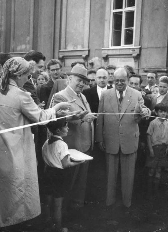 nach der teilung berlins hatte der osten der stadt keinen zoo mehr. am 2. juli 1955 eröffnet ost-berlin in friedrichsfelde seinen eigenen tierpark, der mit damals 60, heute 160 hektar fläche deutlich größer war als der zoologische garten in westberlin und anfangs 400 tiere und heute knapp 11.000 beherbergt. die erste bewohner sind von anderen ddr-zoos gespendet worden oder geschenke wie die brillenbären vom ministerium für staatssicherheit und die kamele aus moskau. auf dem foto von der eröffnung der ddr-präsident wilhelm pieck und der ostberliner oberbürgermeister friedrich ebert junior (sohn des früheren reichtagspräsidenten), zwischen bzw. hinter ihnen heinrich dathe, der langjährige direktor.