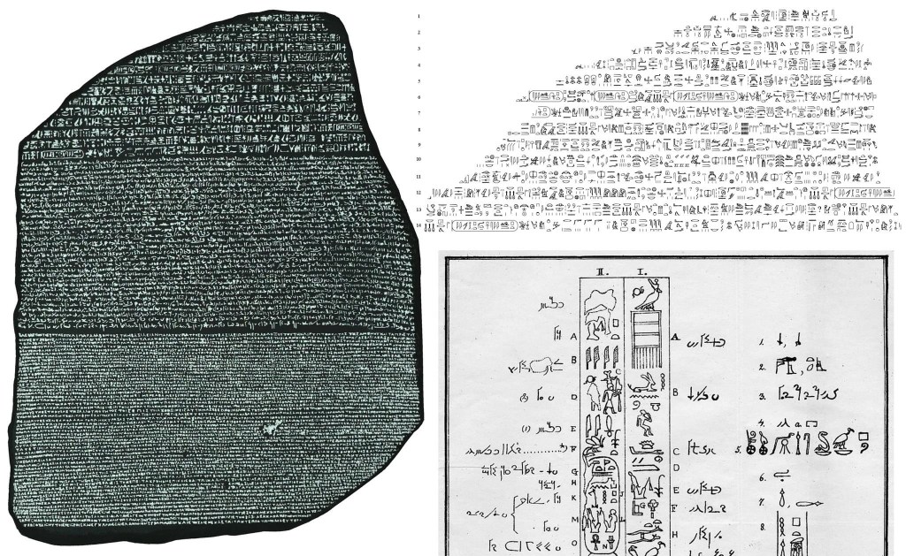 am 15. juli 1799 wurde der „stein von rosetta“ im nildelta entdeckt. weil da ein priesterdekret von 196 v.u.z. in drei sprachen eingemeisselt war, gelang es jean-françois champollion endlich die hieroglypen, die man zuvor für eine reine bilderschrift gehalten hatte, zu entschlüsseln. ein meilenstein für die archäologie.