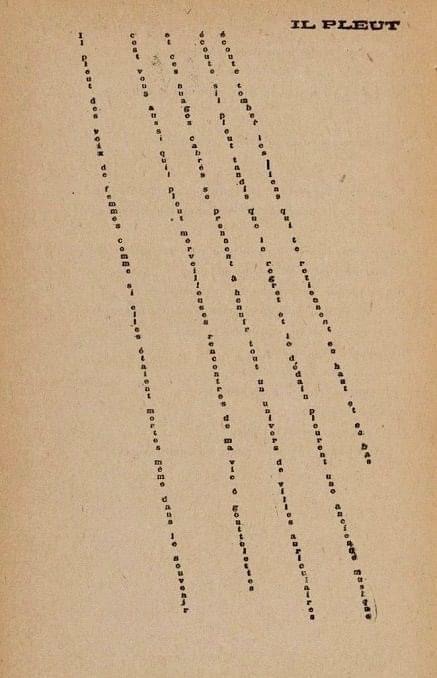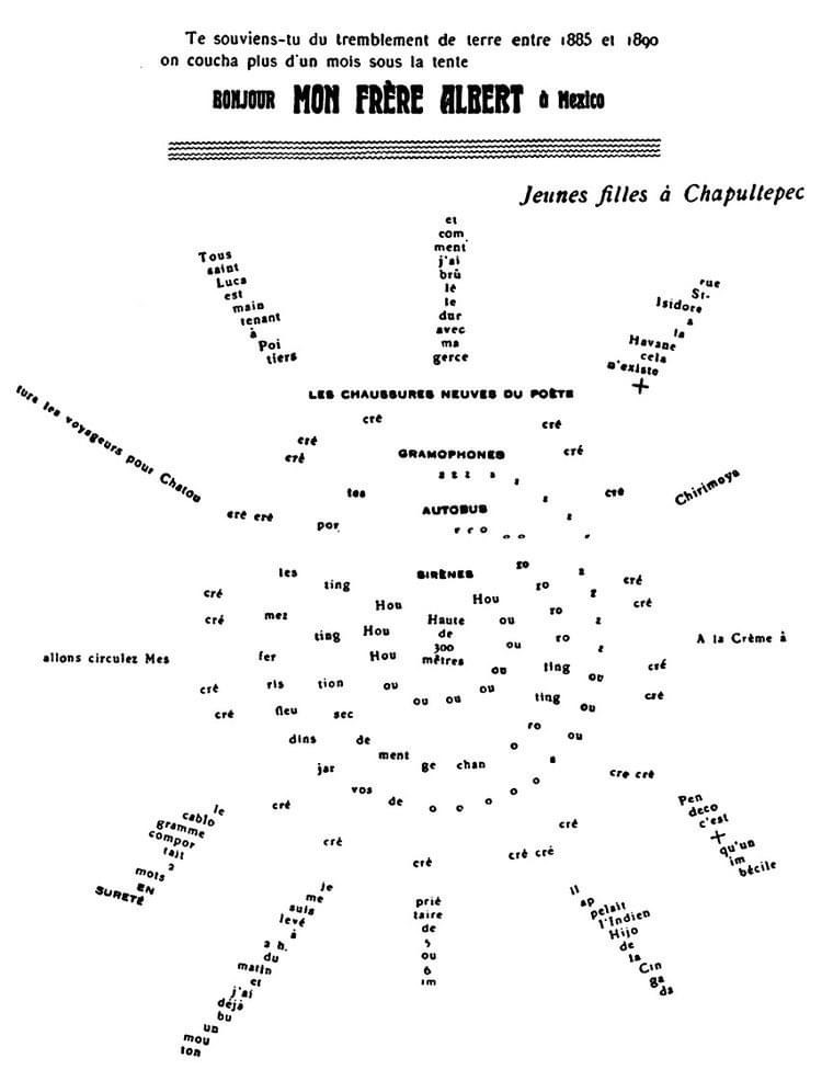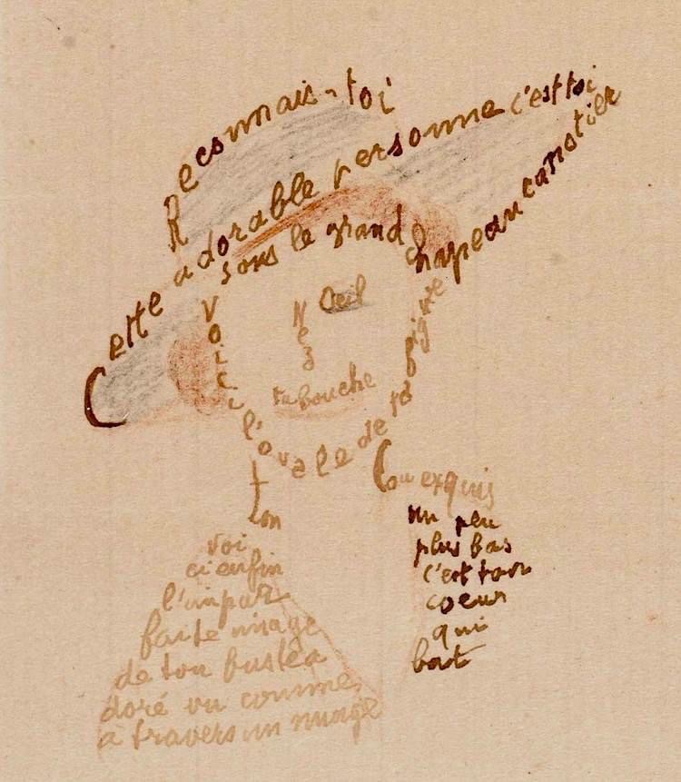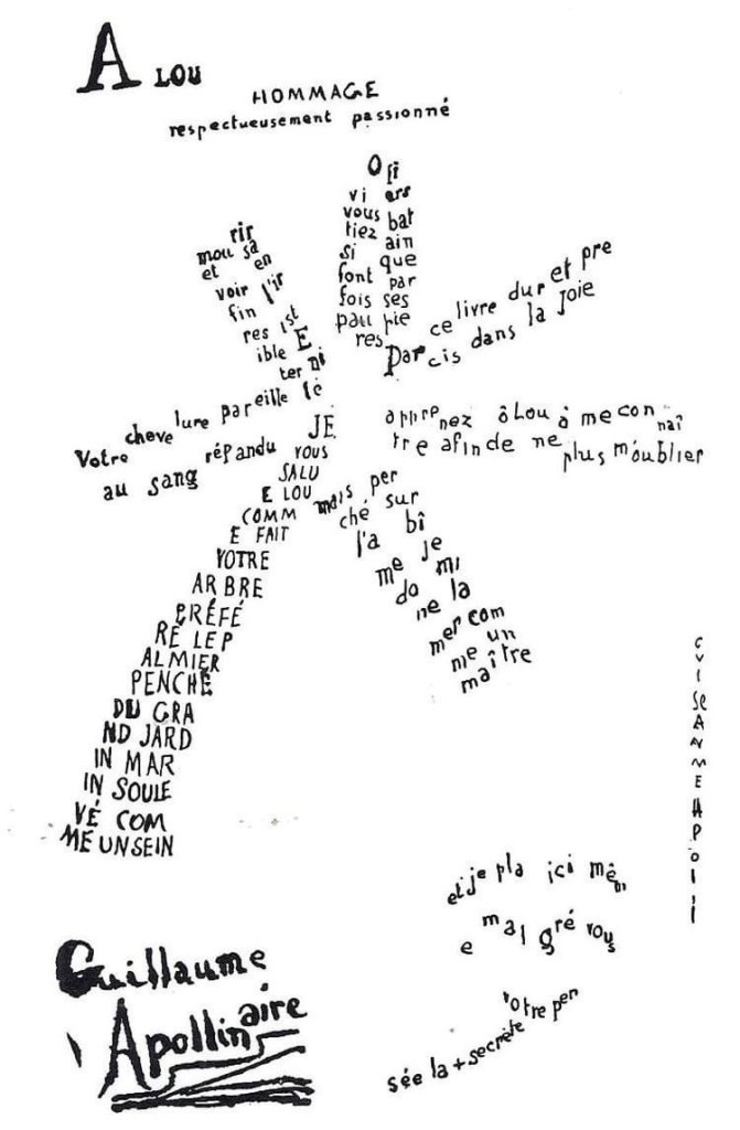 wenn einer dichter werden will und wilhelm albert włodzimierz apolinary de wąż-kostrowicki heißt, hat er schlechte karten. mit 22 gibt sich der junge mann also ein hübsches pseudonym: guillaume apollinaire, und als der wird er der vater der modernen französischen poesie. auch wenn er eigentlich kein franzose ist. er wird in rom geboren, sein polnischer großvater ist beim vatikan beschäftigt und hat eine italienerin geheiratet; seine mutter, angelika kostrowicka wurde in der nähe von grodno (heute belarus) geboren, und war die geliebte eines adligen italienischen ex-offziers, der als sein vater gilt. der spätere guillaume apollinaire wächts italienisch-, polnisch und französischsprachig auf, geht in monaco, cannes und nizza zur schule und kommt 1899 mit seiner mutter nach paris. von seinen literarischen ambitionen kann er allerdings nicht leben. er jobt als ghostwriter, bankangestellter und ist kurzzeitig chefredakteur einer zeitschrift für geldanleger. in der übrigen bewegt er sich in avantgardistischen künstlerkreisen, freundet sich mit pablo picasso, george braque und alfred jarry an und schreibt: essays, romane, theaterstücke, kunstkritiken und gedichte. mit der zeit, so richtig aber erst nach seinem tod, werden die einen großen einfluss auf die entwicklung der dichtung und der modernen kunst haben. auf apollinaire gehen die begriffe „orphismus“, „kubismus“ und „surrealismus“ zurück, lange vor dada verfasst er „ideogramme“ bzw. „calligrammes“ (figurengedichte; siehe die bilder) und verzichtet in gedichten auf die interpunktion (ab 1912). apollinaire zieht als freiwilliger in den ersten weltkrieg, wird schwer verwundet und stirbt mit 38 jahren an der spanischen grippe. heute wäre sein 140. geburtstag. ein paar gedichte: