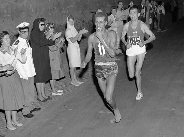 abebe bikila gewinnt am 10. september 1960 in rom die erste goldmeldaille für äthiopien bei olympischen spielen. die 42,195 kilometer legt der 28jährige als einziger barfuß zurück und in der neuen weltbestzeit von 2:15:16 (ich hätte zwei tage gebraucht, mit schuhen und anschließend urlaub). aber zurück zu herrn bikila. viel gibt’s über ihn nicht. 1964 in tokyo wiederholte er seinen erfolg, sechs wochen nach einer blinddarm-op und diesmal mit schuhen, obwohl sein finnischer trainer in studien nachgewiesen hatte, dass er barfuß schneller war. 1969 verunglückte bikila mit seinem auto und war seitdem querschnittsgelähmt. seinen ehrgeiz behielt er, 1970 gewann er ein schlittenrennen in norwegen und nahm an den weltspielen der behinderten im bogenschießen teil, starb aber schon 1973 an den spätfolgen des autounfalls.