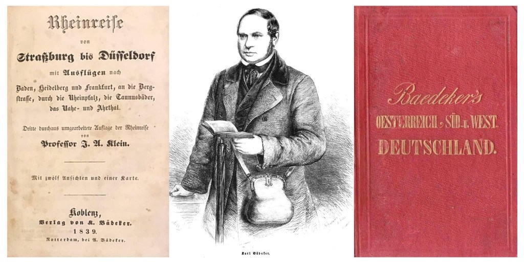 karl baedeker wurde am 2. november 1801 in essen in einer alten buchdrucker- und verleger-dynastie geboren, gründete mit 26 in koblenz seine eigene verlagsbuchhandlung, kaufte einen verlag und gab 1835 das handbuch „rheinreise von mainz bis köln“ von johann august klein überarbeitet und erweitert um die routen nach basel und rotterdam neu heraus. dieses buch gilt als „der erste baedeker“ und stieß auf großes interesse. schließlich hatte wenige jahre zuvor der regelschiffsverkehr auf der strecke begonnen; das gehobene bürgertum bildete und vergnügte sich beim reisen, besucher aus dem ausland kamen, und im zentrum des ersten touristenbooms lag koblenz…