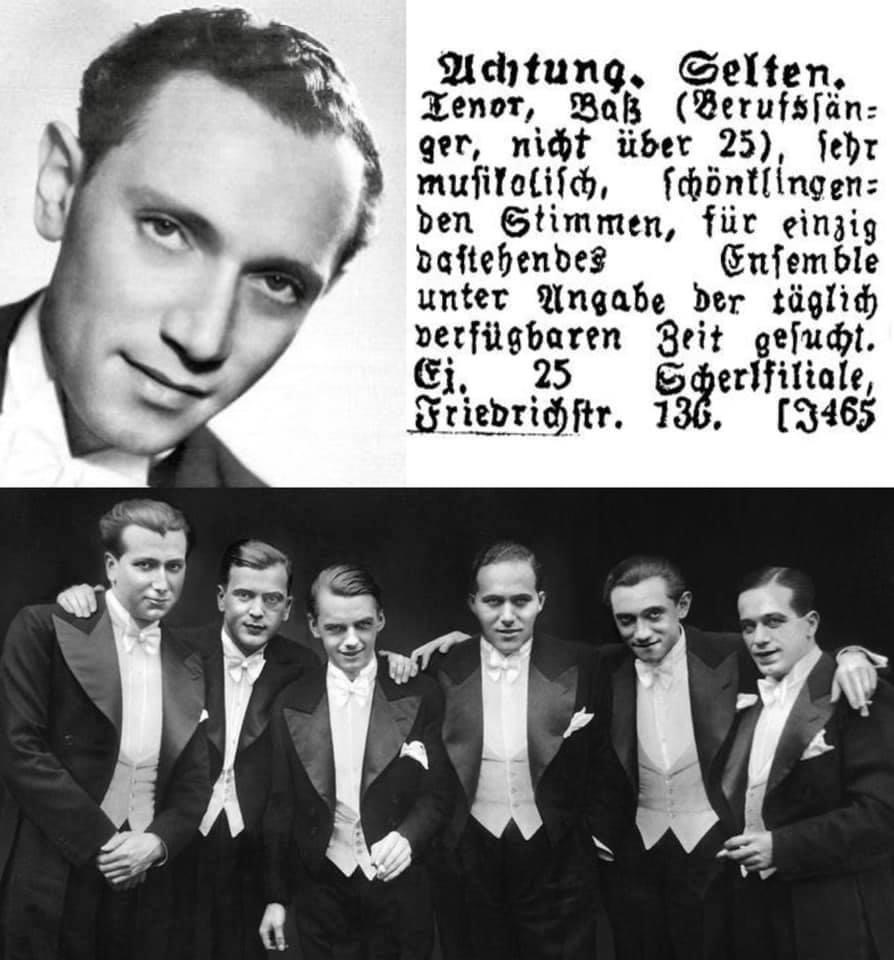 angefangen hatte alles mit einer zeitungsanzeige, die der junge sänger und arrangeur harry frommermann (*12.10. 1906) am 28. dezember 1927 im berliner lokal-anzeiger aufgegeben hatte: „achtung. selten. tenor, baß (berufssänger, nicht über 25), sehr musikalisch, schön klingende stimmen, für einzig dastehendes ensemble, unter angabe der täglich verfügbaren zeit gesucht.“ zwei tage später dann großes vorsingen in frommermanns dachkammer in der stubenrauchstraße 47 in berlin-friedenau. trotz des großen andrangs (ca. 70 interessenten, darunter auch johannes heesters) findet frommermann nur einen geeigneten kandidaten, den baß robert biberti, der bald aber weitere sänger anschleppt. im januar 1928 die ersten proben, und im mai bereits der erste plattenvertrag. und dann geht alles schlag auf schlag.