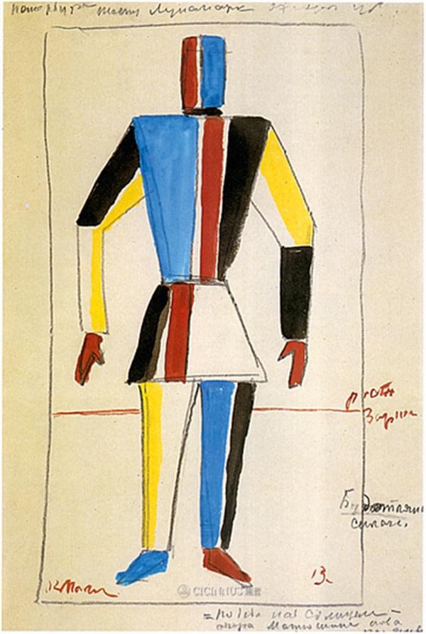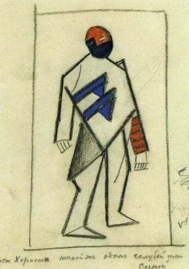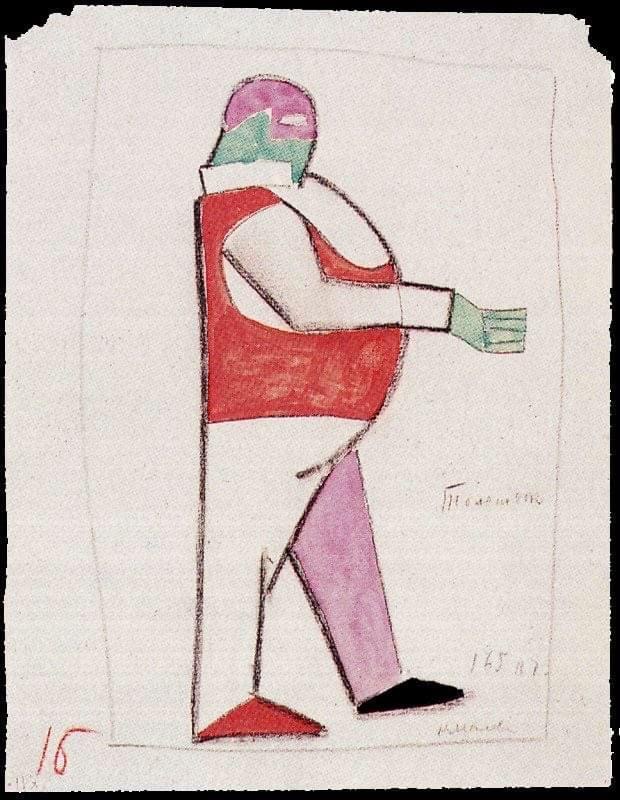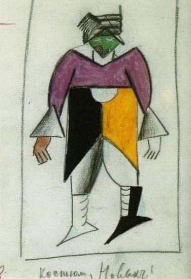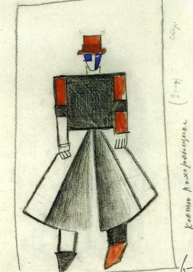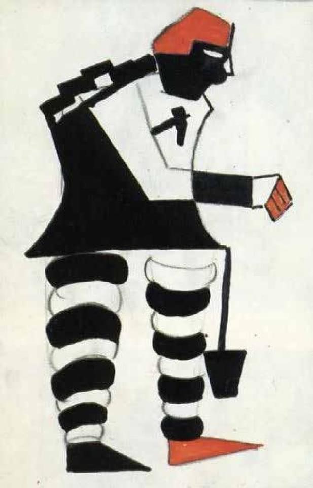 die mag ich: kasimir malewitschs figurinen für die erste futuristische oper „sieg über die sonne“ („победа над солнцем“) 1913. malewitsch war für kostüme, bühnenbild und licht zuständig, die musik stammte von michail matiuschin, der text von alexei krutschonich und welimir chlebnikow. sie arbeiteten in uusikirkko (damals finnland, heute das russische poljany) und malewitsch malte hier auch sein erstes schwarzes quadrat auf einen der bühnenvorhange, der grund, warum er später den beginn des suprematismus mit 1913 angab. die oper sollte nach dem ersten panrussischen kongress der futuristen eine attacke auf „das bollwerk des künstlerischen elends“ werden und den übergang vom kubismus in gegenstandslosigkeit inszenieren. dazu gehörten dada-artige monologe in einer kunstsprache, absichtliches falschsingen, das beschimpfen und bespucken des publikums und die begleitung auf einem umgestimmten klavier und mit propeller- und maschinengeräuschen. uraufgeführt wurde das werk im lunapark-theater in sankt petersburg. der abend endete erwartungsgemäß mit einem hübschen skandal, und reale prügel von den zuschauern. die oper selbst ist leider nur in bruchstücken erhalten. ab und zu versucht sich eine theatertruppe an ihrer rekonstruktion.
