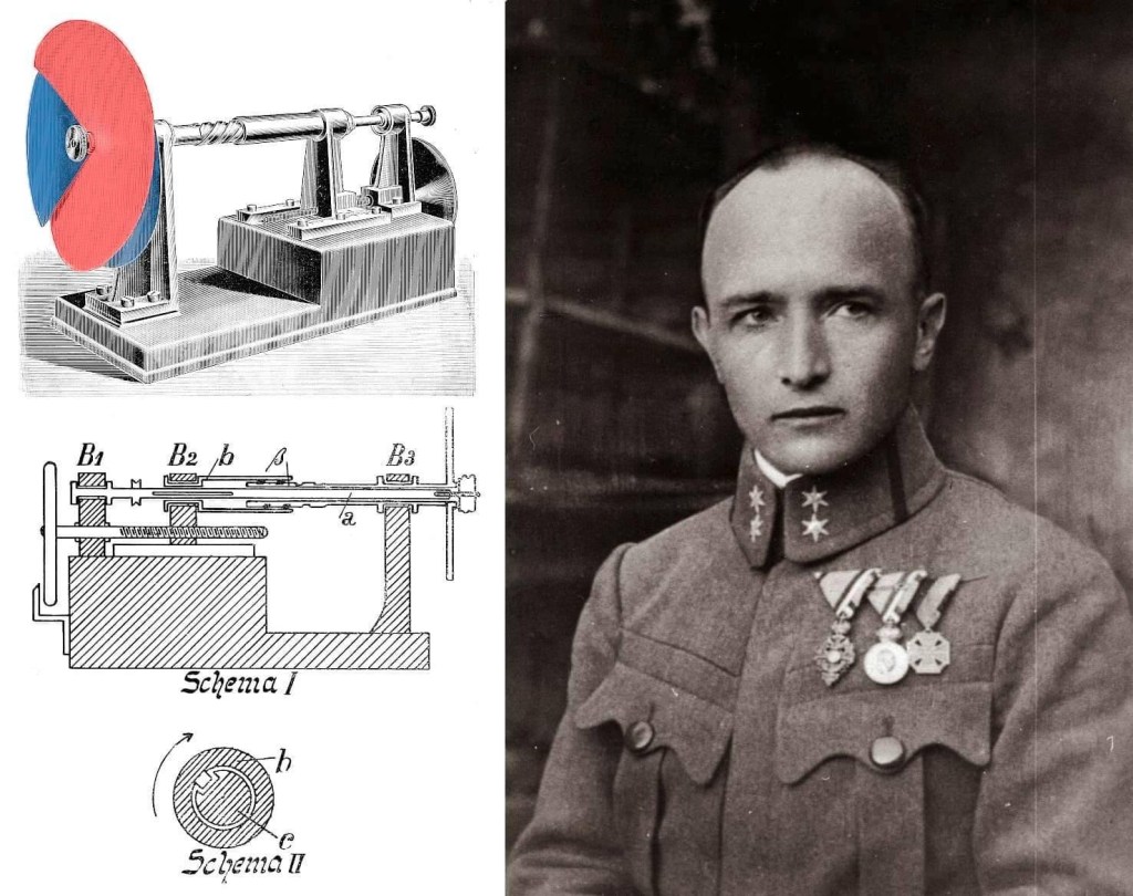 „Den hier abgebildeten Apparat habe ich konstruiert, als ich am Berliner Psychologischen Institut [1906 yu] arbeitete. … Man verwendet solche Farbkreisel zu allen möglichen psychologischen, physiologischen und physikalischen Zwecken; es sind Apparate, welche man statt der teuren und umständlichen Spektralapparate benützt, wo es nicht auf feinste Genauigkeit ankommt. Ihr Prinzip ist aus der Schule bekannt. Man schiebt zwei farbige Blätter, von denen eines radial aufgeschlitzt ist, so ineinander, daß die Farbflächen in dem gewünschten Größenverhältnis zueinander stehen; dann setzt man den Kreisel in Rotation, und sobald die Umdrehungsgeschwindigkeit groß genug ist, entsteht für das Auge die angestrebte Mischfarbe. … das Wesen des abgebildeten Apparates besteht eben darin, daß man … die Änderung während der Rotation durchführen kann und in der Lage ist, in beständigem Fluß jede Farbe vorzuführen, die sich aus zwei gegebenen Farben überhaupt herstellen läßt.“