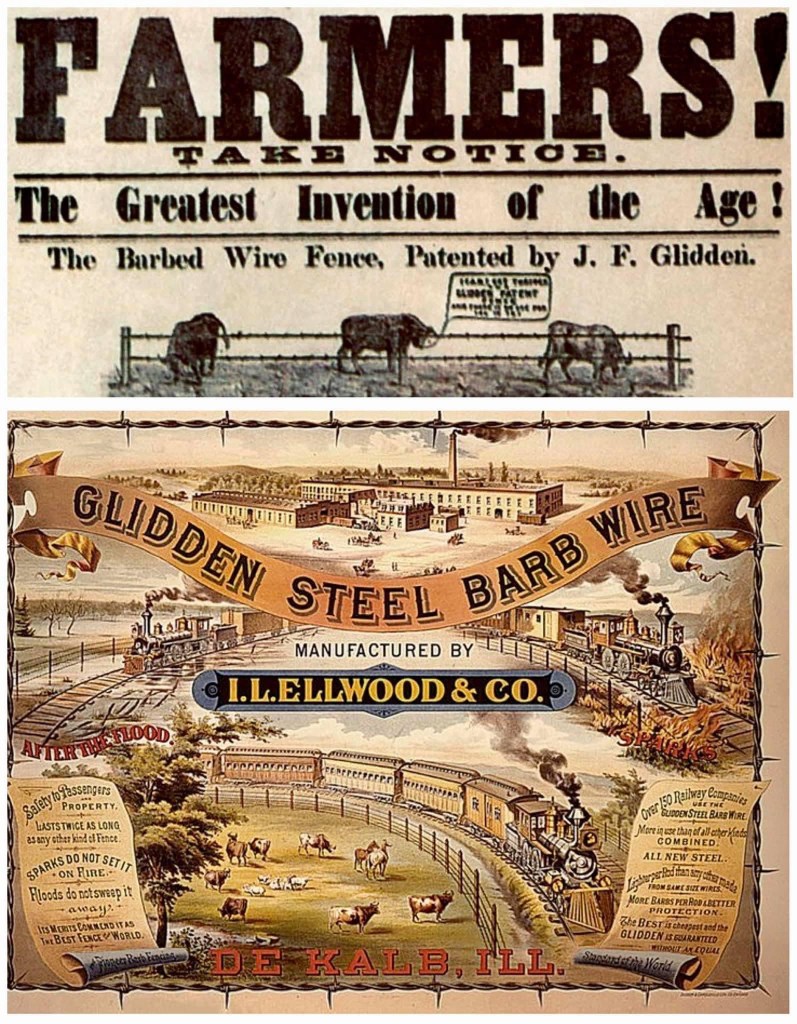 es war die zeit, als die bisonherden der indianer schon ausgerottet waren, und die texanischen rancher begannen, longhorn-rinder zu züchten, zu weiden und sie vom süden bis zur kanadischen grenze zu treiben, wo sie in den schlachthäusern von chicago getötet wurden. zugleich enstanden entlang dieses weges eisenbahnstrecken und neue städte und die zahl der rinder nahm zu. die rancher sahen sich gezwungen, land unter ihre kontrolle zu bringen, um ausreichend futter zu haben, die farmer mussten ihre äcker davor schützen, dass die tiere sie kahlfraßen und die eisenbahngesellschaften verhindern, dass die herden ihre schienenwege versperrten. in einigen gegenden errichtete man steinwälle, hecken oder holzzäune, aber entlang der great plains gab es nicht genug solcher traditioneller materialien. glidden entwickelte, die mißlungenen versuche anderer bastler aufnehmend (die sich an den sporen der cowboy-stiefel orientiert hatten), nun einen draht, bei dem zwei spanndrähte miteinander verseilt und dazwischen stachel eingesetzt wurden. und meldete ihn heute vor 147 jahren zum patent an. sein stacheldraht war nicht nur effektiv, er war auch billiger als ein holzzaun und es bedurfte weniger arbeit, ihn zu errichten, und so begann im folgejahr schon die massenproduktion. die großen rinderzüchter zäunten legal und illegal weiträumig land ein und es begann ein weidekrieg, weil die kleinere züchter dazu nicht in der lage waren und sich darauf verlegten, die drähte durchzuschneiden, woraufhin die großen scharfschützen anstellten. viele cowboys wurden arbeitslos und natürlich wurde so auch die indigene bevölkerung weiter eingeschränkt und konnte sich in ihrem land nicht mehr frei bewegen; die indianer nannten stacheldraht „teufelsschnur“. sechs jahre nach der patentvergabe betrug die gesamtlänge der in den usa errichteten stacheldrahtzäune bereits über 50000 meilen. außerhalb der vereinigten staaten soll der erste ende 1877 im botanischen garten von rio de janeiro aufgebaut worden sein. in australien und neuseeland veränderte seine einführung die wirtschaft grundlegend; die meisten bewohner lebten von der schafzucht, der stacheldraht ermöglichte zunehmend den verzicht auf die teure arbeit der schafhirten und dafür die haltung deutlich größerer tierherden als vorher…