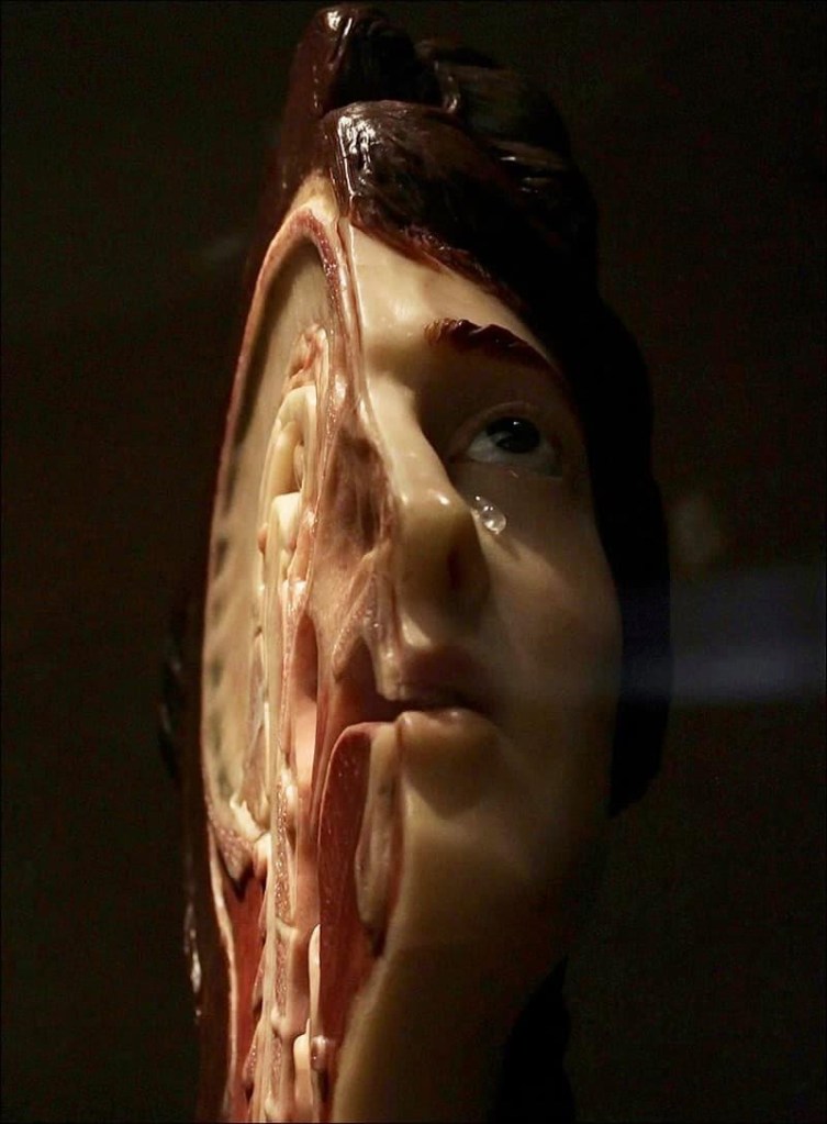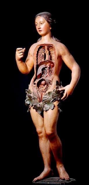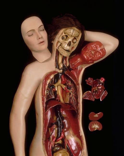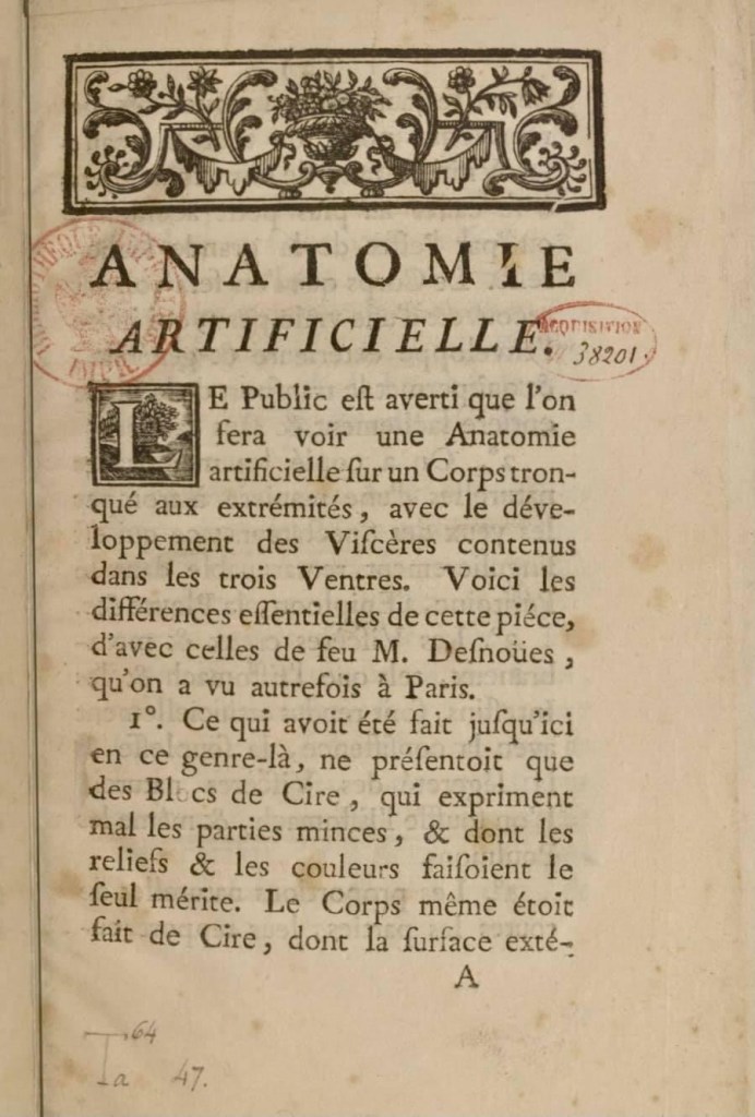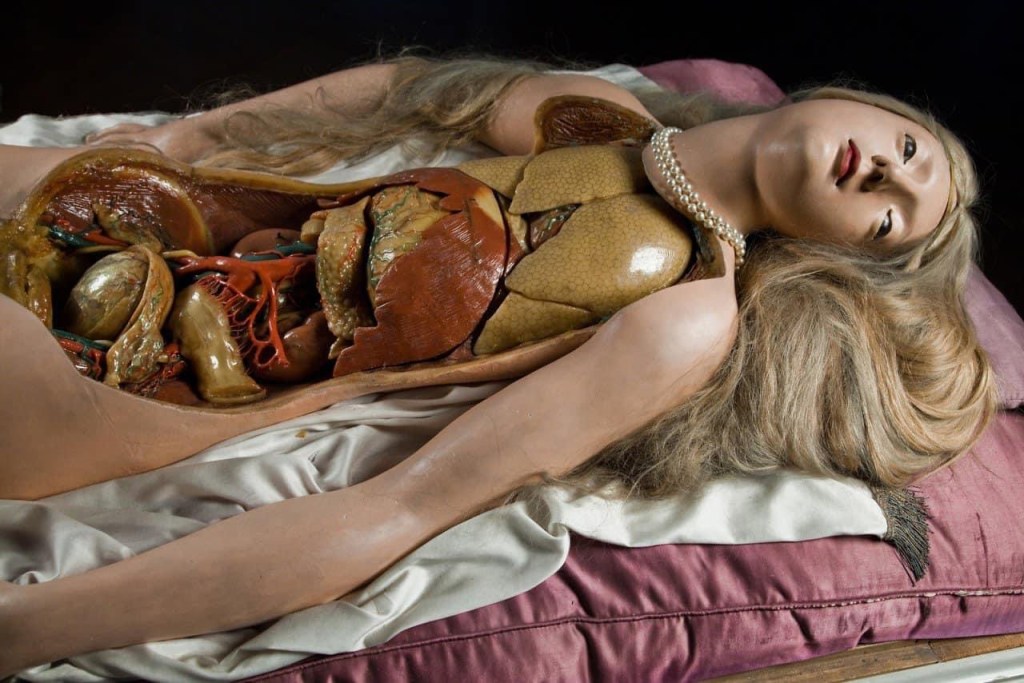 daneben gab bihéron privat anatomieunterricht (offiziell war auch das frauen nicht erlaubt); zu ihren studenten gehörten denis diderot und benjamin franklin. und sie verkaufte ihre modelle, u.a. an den könig von dänemark und über den russischen botschafter an kaiserin katharina II. 1786 erwarb königin marie antoinette die sammlung im tausch gegen eine kleine leibrente für marie marguerite bihéron, die zu dieser zeit offenbar schon krank war und 1795 starb (die revolutionsregierung hat ihr die rente wieder entzogen). nach bihéron war es louis thomas jérôme auzoux, der die präzision und die haltbarkeit der modelle des menschlichen körpers weiter verfeinerte, indem er pappmaché statt wachs benutzte, bis zum ende des 19. jh. die ära der gips- und kunststoffmodelle anbrach…