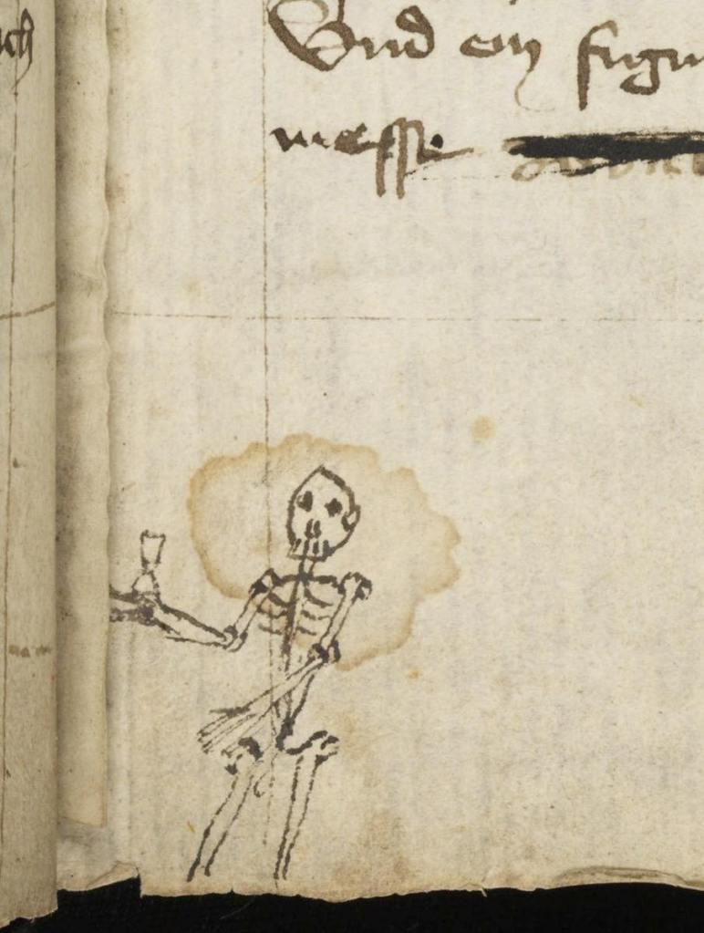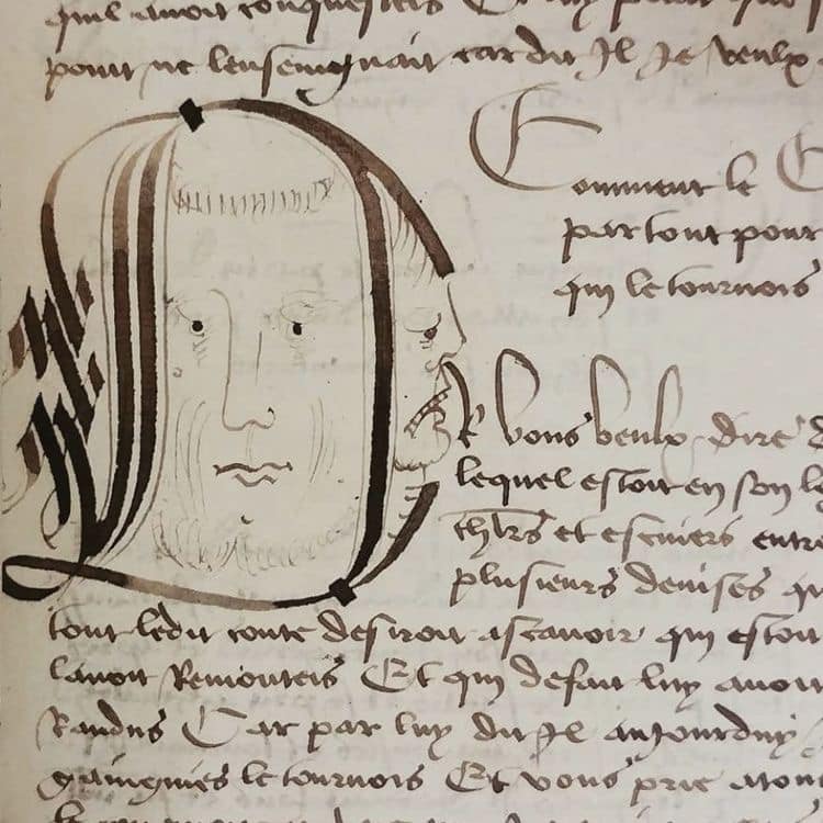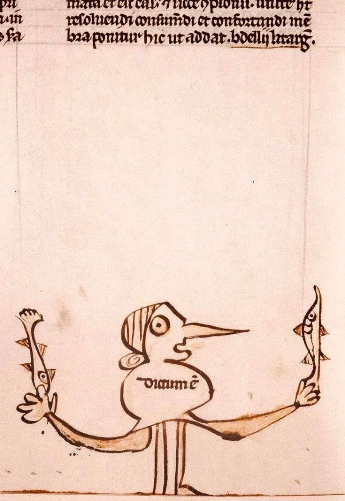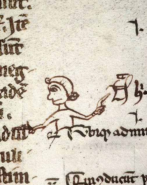 menschen kritzeln anscheinend schon immer herum – aus langeweile, um schreibgeräte auszuprobieren oder aus freude am zeichnen. der niederländische buchhistoriker erik kwakkel hat gezielt nach den anfängen dieser kritzeleien gesucht und ist fündig geworden – in büchern aus dem mittelalter, mit denen kindern moral beigebracht werden sollte und in manuskripten, die klosterschreiber zu kopieren hatten und die ihre stumpf gewordenen federn nach dem schärfen auf leeren seiten oder deckblättern mit linien, wörtern oder figuren getestet haben, bevor sie wieder an den eigentlichen text gingen. kwakkel konnte auf diese weise u.a. nachweisen, dass in manchen skriptorien mehrere schreiber an einem dokument gearbeitet haben und wo sie herkamen, weil sich die buchstabenformen je nach ausbildungsort und regionalen schreibarten unterscheiden. unterhaltsamer aber sind seine funde, die offenbar von gelangweilten schülern stammen – männchen, ritter, damen, tiere oder gesichter in den initial-buchstaben der kapitelanfänge. (erinnert mich an meine eigenen bis zum rand vollgemalten schulbücher. love it!)