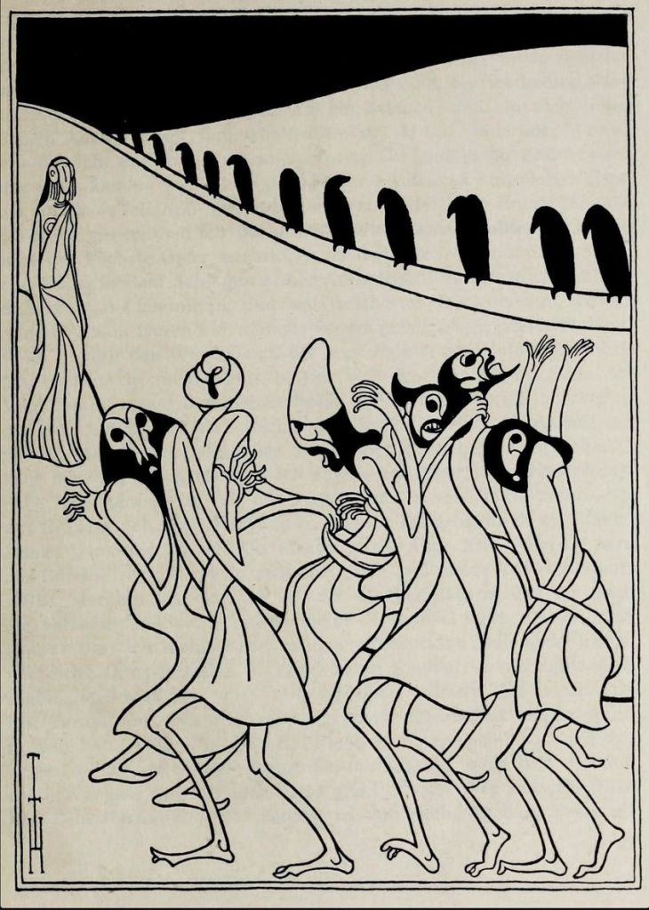 da wohl heines karikaturen bekannt sind, hier mal was anderes schönes: einige holzschnitte, mit denen er 1908 eine ausgabe von friedrich hebbels „judith“ (und holofernes) illustriert hat.