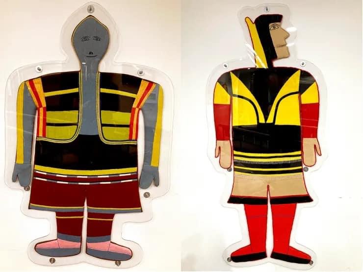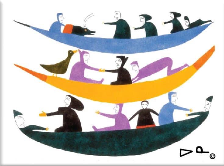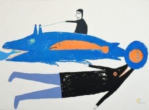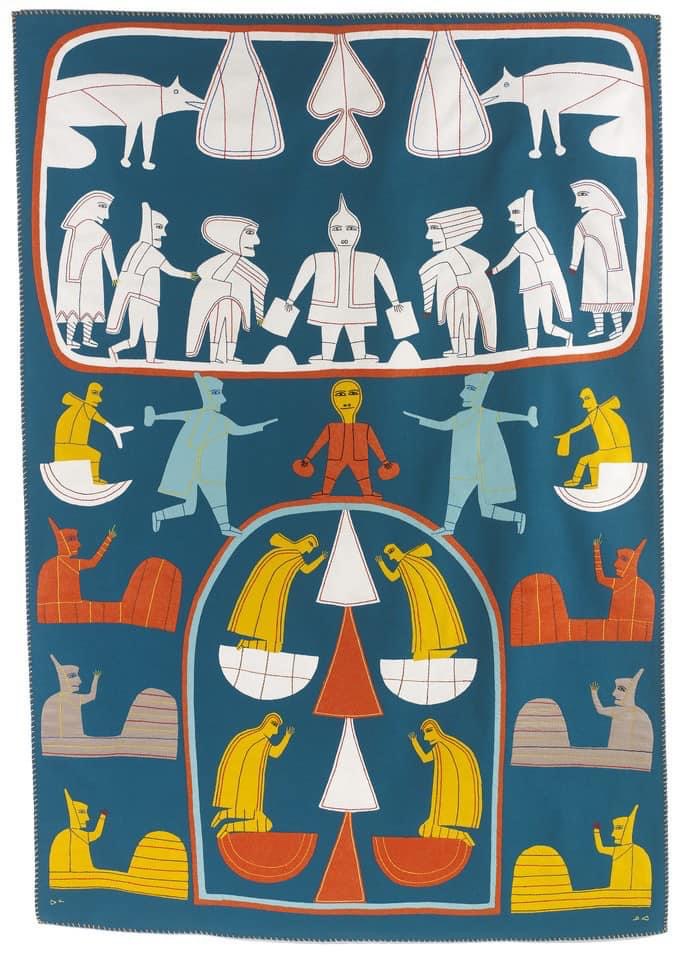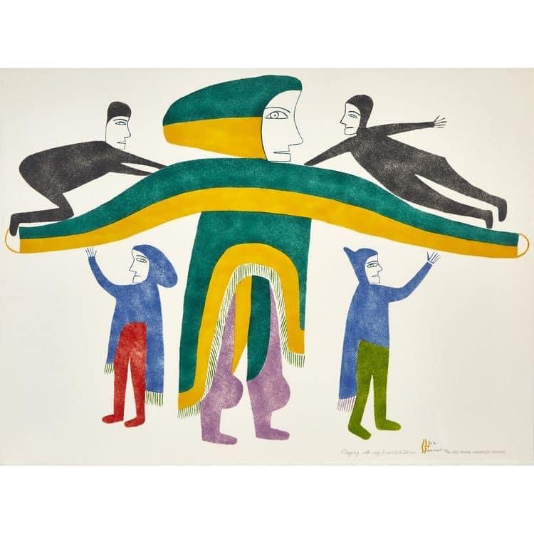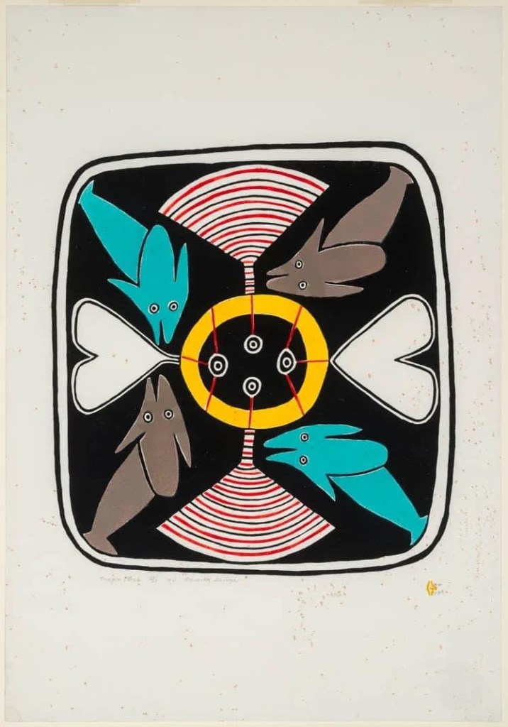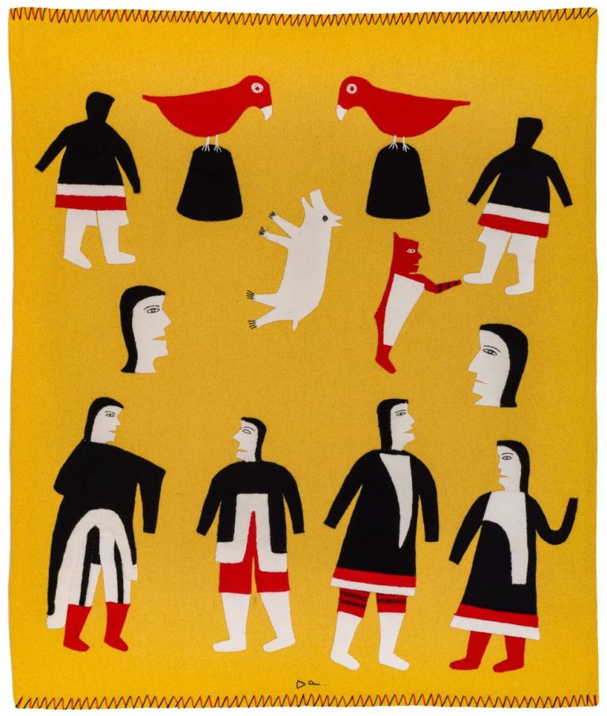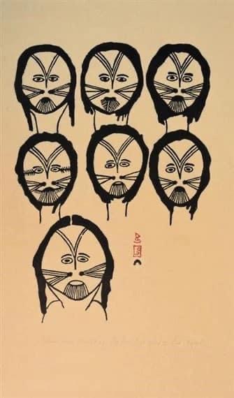 jessie oonark (1906-1985) aus der volksgruppe der utkuhiksalingmiut hatte ein hartes leben hinter sich, als sie mit ihren szenen aus der kultur und lebenswelt der inuit zu einer derer bedeutendsten künstlerinnen wurde. ihre familie lebte wie die meisten anderen von der jagd, dem fallenstellen und fischfang – und in bitterer armut. jessie (una) musste schon als kind mit dem nähen von kleidung aus robbenfell zum unterhalt beitragen, wurde sehr jung verheiratet, gebar zwölf kinder und gehört zu den generationen inuit, die von der kanadischen regierung mit einer disc-nummer gekennzeichnet wurden, ähnlich einer hundemarke (diese scheiben mit der aufschrift „eskimo identification canada“ und der jeweiligen nummer, jessies lautete E2-384, mussten um den hals getragen oder in die kleidung eingenäht werden; sie wurden in einigen regionen erst 1978 wieder abgeschafft). anfang der 50er-jahre starben jessies mann und ihre vier jüngsten kinder während einer durch umweltveränderungen und dezimiertem tierbestand hervorgerufenen großen hungersnot. die übrige familie überlebte knapp, weil sie noch rechtzeitig umgesiedelt wurde. an dem neuen ort, baker lake, begann jessie, nachdem sie schulkinder beim zeichnen beobachtet und ihr jemand buntstifte und papier geschenkt hatte, im alter von 54 jahren zu malen. ein jahr später wurde sie „entdeckt“ …