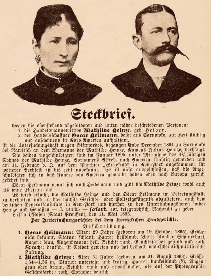 Über den Steckbrief hinausgehende Umstände der Tat verrät z. B. „Der Deutsche Correspondent“ aus Baltimore vom 22. Juni. Demnach war Mathilde mit dem deutlich älteren Schwarzviehhändler Julius Heinze aus Sarnowko, Provinz Posen, verheiratet und hatte dort ihren späteren geliebten Oskar Heilmann, auch aus Sarnowko, kennengelernt.