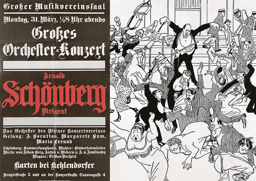 ein zeitungsbericht vom folgenden tag: „Nach dem opus 9 von Schönberg, seiner schon vor einigen Jahren abgelehnten Kammersymphonie, mischten sich leider in das wütende Zischen und Klatschen auch die schrillen Töne von Hausschlüsseln und Pfeifchen und auf der zweiten Galerie kam es zur ersten Prügelei des Abends. Von allen Seiten wurde nun in wüsten Schreiereien Stellung genommen und schon in dieser unnatürlich langen Zwischenpause gerieten die Gegner hart aneinander. Zwei Orchesterlieder nach Ansichtskartentexten von Peter Altenberg von Alban Berg raubten aber auch den bisher Besonnenen die Fassung (…) Dadurch aber, daß Schönberg inmitten des Liedes abklopfte und in das Publikum die Worte schrie, daß er jeden Ruhestörer mit Anwendung der öffentlichen Gewalt abführen lassen werde, kam es neuerlich zu aufregenden und wüsten Schimpfereien, Abohrfeigungen und Forderungen. Herr von Webern schrie auch von seiner Loge aus, daß man die ganze Bagage hinausschmeißen sollte und aus dem Publikum kam pünktlich die Antwort, daß man die Anhänger der mißliebigen Richtung der Musik nach Steinhof [in die wiener nervenheilanstalt] abschaffen müßte. Das Toben und Johlen im Saale hörte nun nicht mehr auf. Es war gar kein seltener Anblick, daß irgend ein Herr aus dem Publikum in atemloser Hast und mit affenartiger Behendigkeit über etliche Parkettreihen kletterte, um das Objekt seines Zornes zu ohrfeigen. Der einschreitende Polizeikommissär konnte in diesem Chaos wild aufgepeitschter Leidenschaften nichts ausrichten. Wollte er in irgend einem Rudel Raufender intervenieren und Ruhe schaffen, so hörte man zu gleicher Zeit von allen Seiten das Aufklatschen von Ohrfeigen. (…) Alle möglichen Leute stürmten nun auf die vor Aufregung schreckensbleichen und zitternden Musiker ein und beschworen sie, das Podium zu räumen und das Konzert zu beenden (…)“. was dann auch geschah.