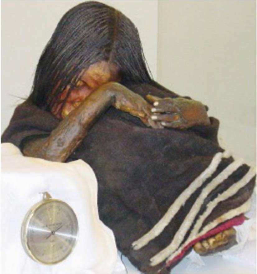 traurig. trotzdem faszinierend, dass man dank dieses fundes nun so viel weiß über ein kind, das vor über 500 jahren gelebt hat: der junge war etwa 8,3 jahre alt, 1,42 groß, 35 kilo schwer und hatte blutgruppe 0. sein schwarzes haar war zu fast 200 zöpfchen geflochten und sein gesicht mit roten und ockerfarbenen streifen bemalt. seiner kleidung nach stammte der kleine aus dem süden des inka-reiches und aus einer wohlhabenden familie. er hatte eine tunika aus schwarzer lamawolle mit weißen streifen an, einen umhang, ungebrauchte mokassins, ein breites silberarmband, eine silberplakette um den hals und einen kopfschmuck aus wolle mit schwarzen fransen und kondorfedern. er hatte akne-narben, verhornte fußsohlen, einige erfrorene zehen, warzen an den händen und war von kopfläusen und trichinen befallen, ansonsten aber gesund und wies keinerlei zeichen von gewaltanwendung auf. nun schläft er seinen ewigen schlaf in einer klimakammer weiter.
