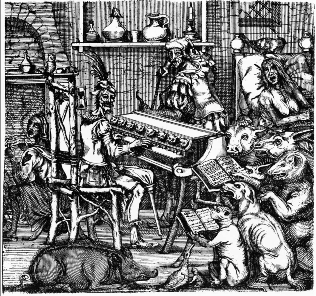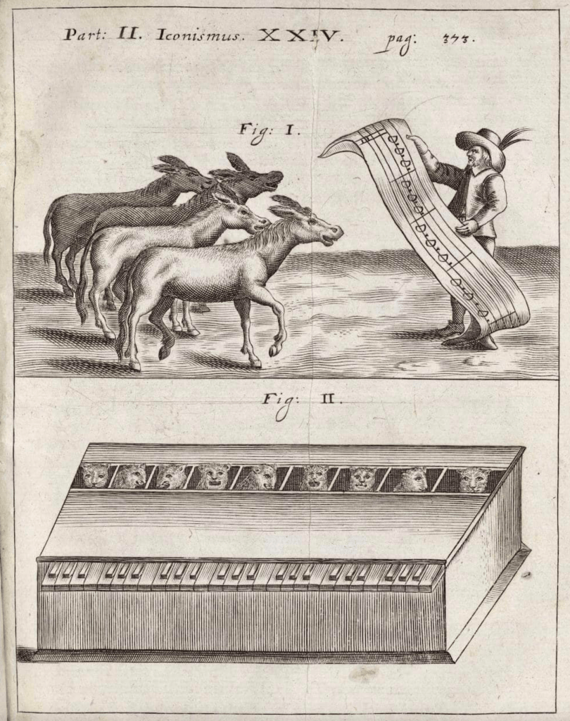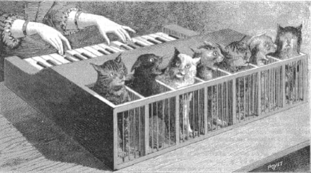 „um die stimmung eines italienischen prinzen zu heben, der von den sorgen seiner position belastet war, schuf ein musiker für ihn ein katzenklavier. der musiker wählte katzen aus, deren natürliche stimmen in unterschiedlichen tonhöhen waren, und ordnete sie so nebeneinander in käfigen an. wenn eine taste auf dem klavier gedrückt wurde, trieb ein mechanismus einen scharfen dorn in den schwanz der entsprechenden katze. das ergebnis war eine melodie von miauen, die immer heftiger wurde, je verzweifelter die katzen wurden. wer konnte nicht anders, als über solche musik zu lachen? so wurde der prinz aus seiner melancholie erweckt…“ (dritte abbildung)